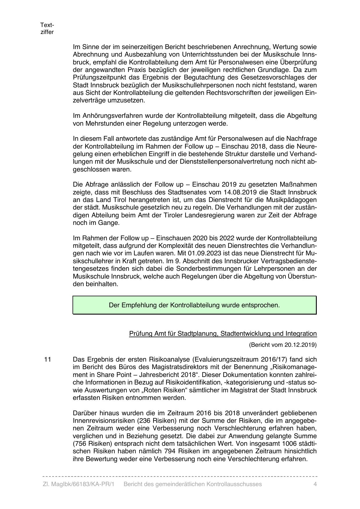 im Bericht des Büros des Magistratsdirektors mit der Benennung „Risikomanagement in Share Point – Jahresbericht 2018“. Dieser Dokumentation konnten zahlreiche Informationen in Bezug auf Risikoidentifikation, -kategorisierung und -status sowie Auswertungen von „Roten Risiken“ sämtlicher im Magistrat der Stadt Innsbruck