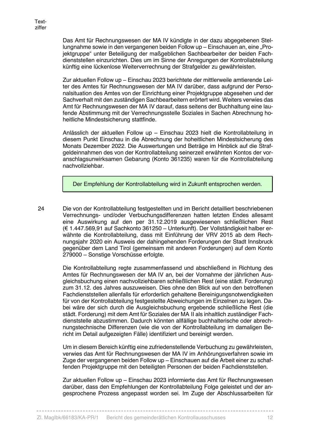 (€ 1.447.569,91 auf Sachkonto 361250 – Unterkunft). Der Vollständigkeit halber erwähnte die Kontrollabteilung, dass mit Einführung der VRV 2015 ab dem Rechnungsjahr 2020 ein Ausweis der dahingehenden Forderungen der Stadt Innsbruck