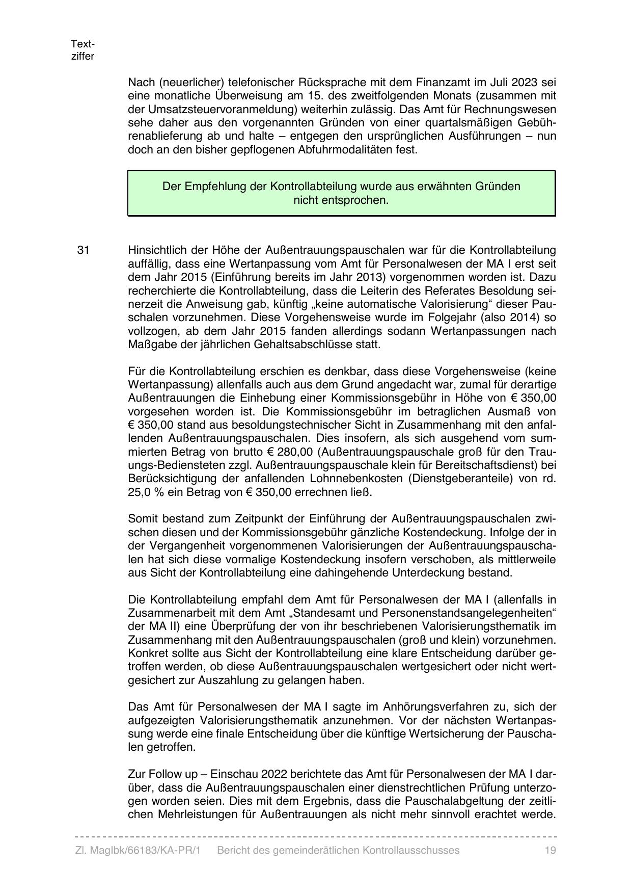 Konkret sollte aus Sicht der Kontrollabteilung eine klare Entscheidung darüber getroffen werden, ob diese Außentrauungspauschalen wertgesichert oder nicht wertgesichert zur Auszahlung zu gelangen haben.