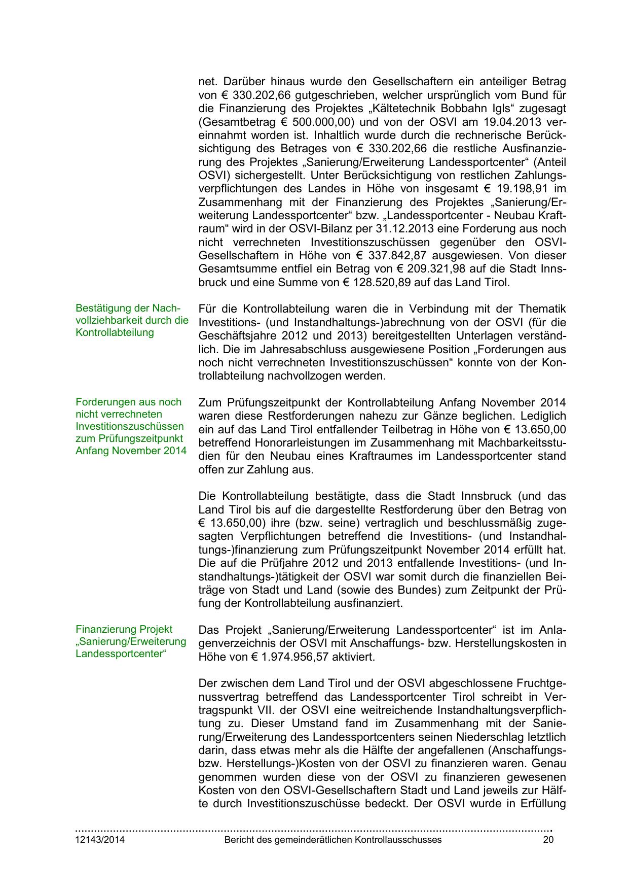 Der zwischen dem Land Tirol und der OSVI abgeschlossene Fruchtgenussvertrag betreffend das Landessportcenter Tirol schreibt in Vertragspunkt VII. der OSVI eine weitreichende Instandhaltungsverpflichtung zu. Dieser Umstand fand im Zusammenhang mit der Sanierung/Erweiterung des Landessportcenters seinen Niederschlag letztlich