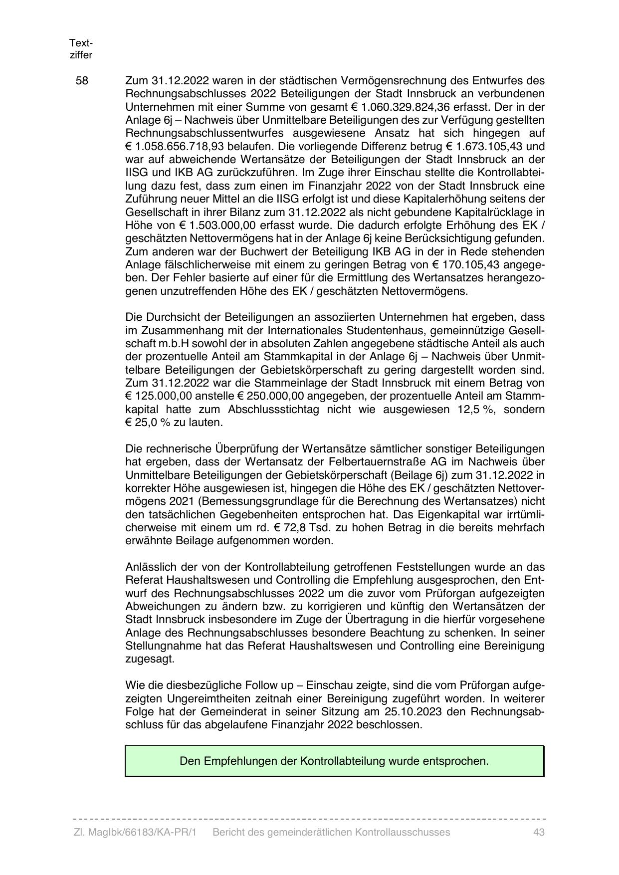 war auf abweichende Wertansätze der Beteiligungen der Stadt Innsbruck an der