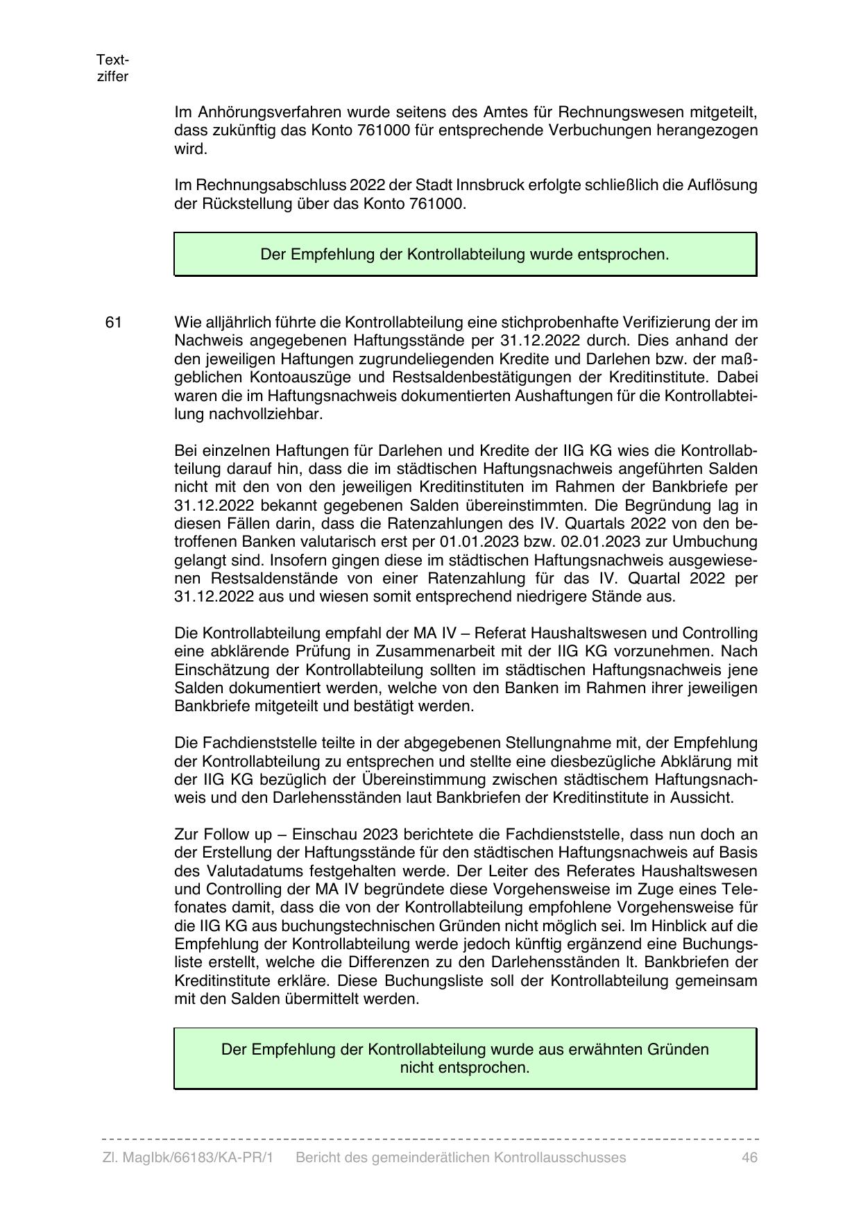 Bei einzelnen Haftungen für Darlehen und Kredite der IIG KG wies die Kontrollabteilung darauf hin, dass die im städtischen Haftungsnachweis angeführten Salden