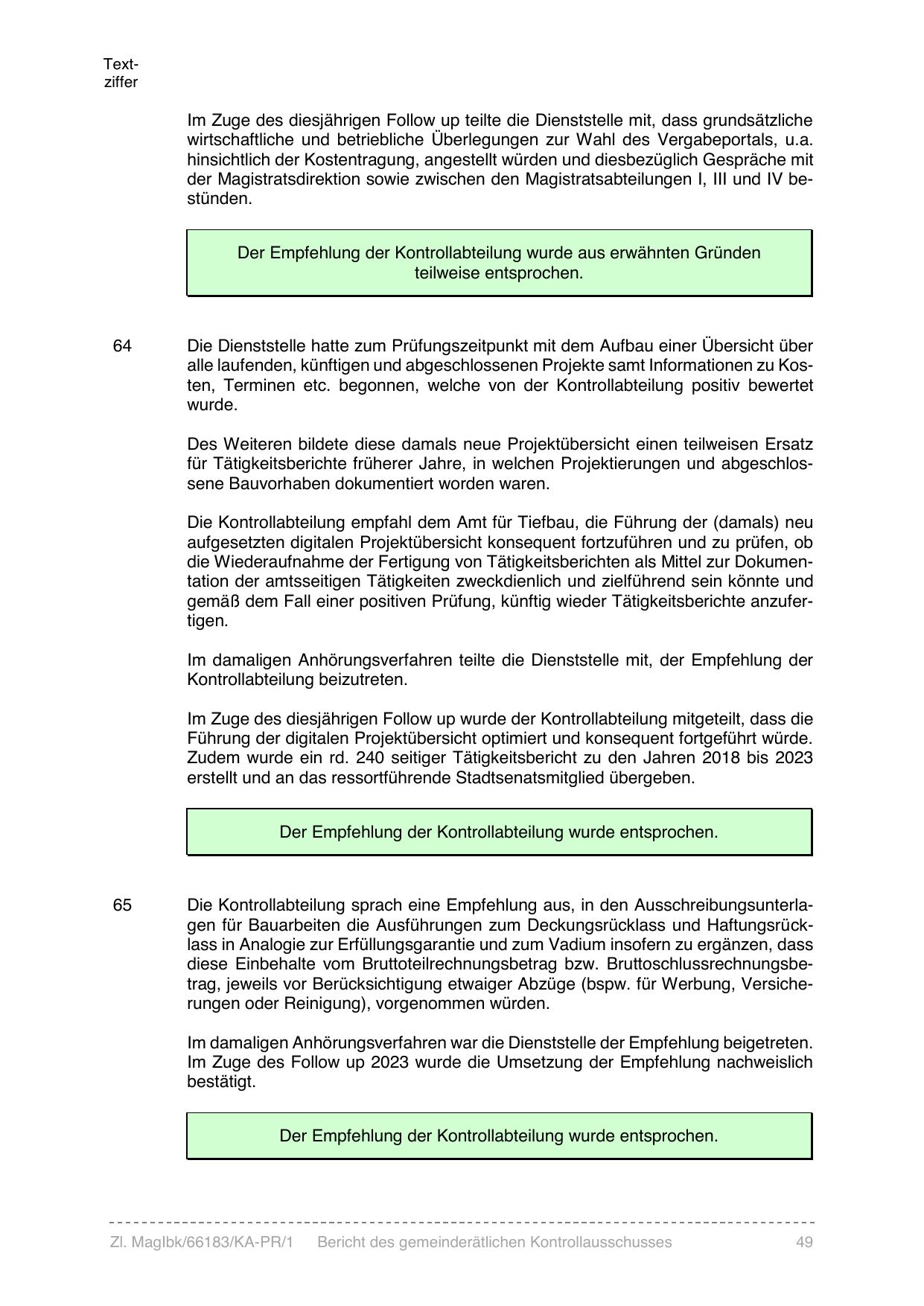 Der Empfehlung der Kontrollabteilung wurde entsprochen.