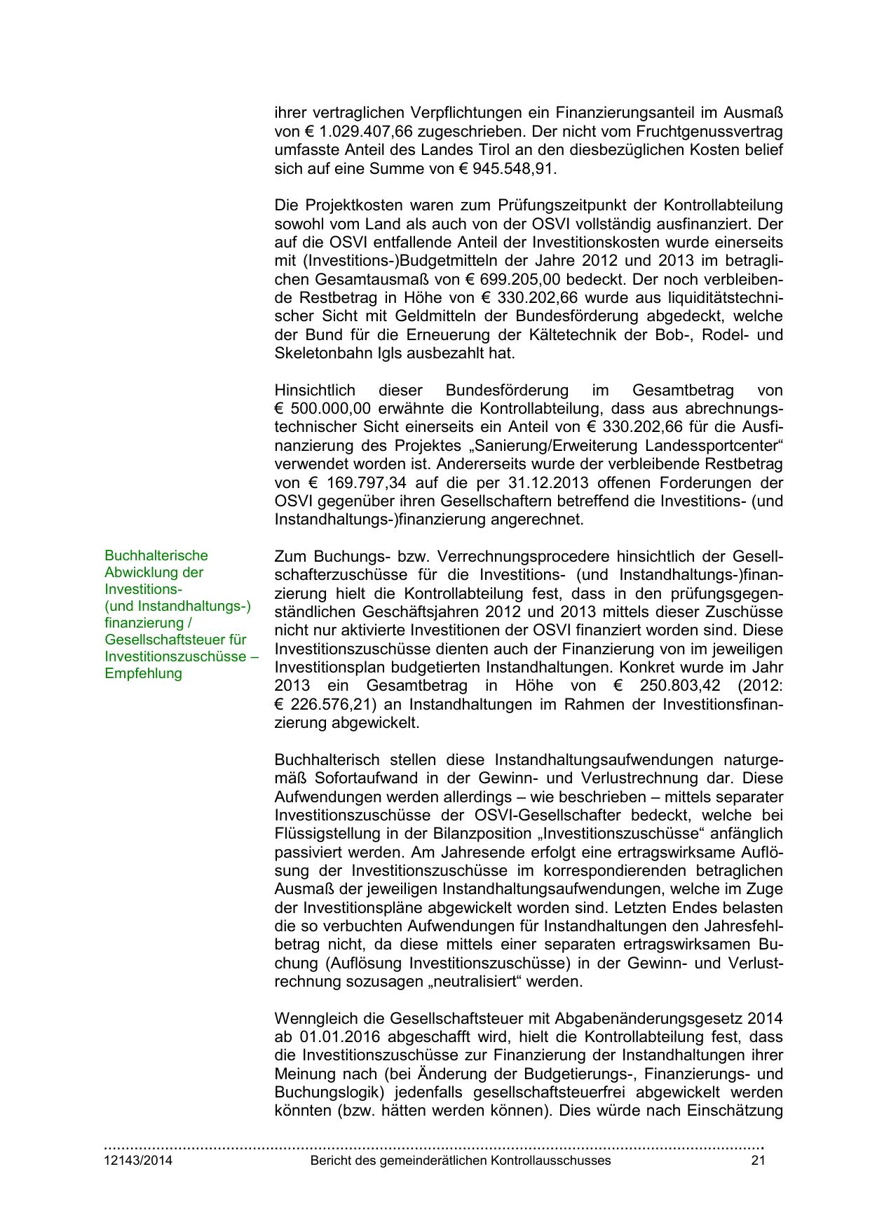 € 500.000,00 erwähnte die Kontrollabteilung, dass aus abrechnungstechnischer Sicht einerseits ein Anteil von € 330.202,66 für die Ausfinanzierung des Projektes „Sanierung/Erweiterung Landessportcenter“