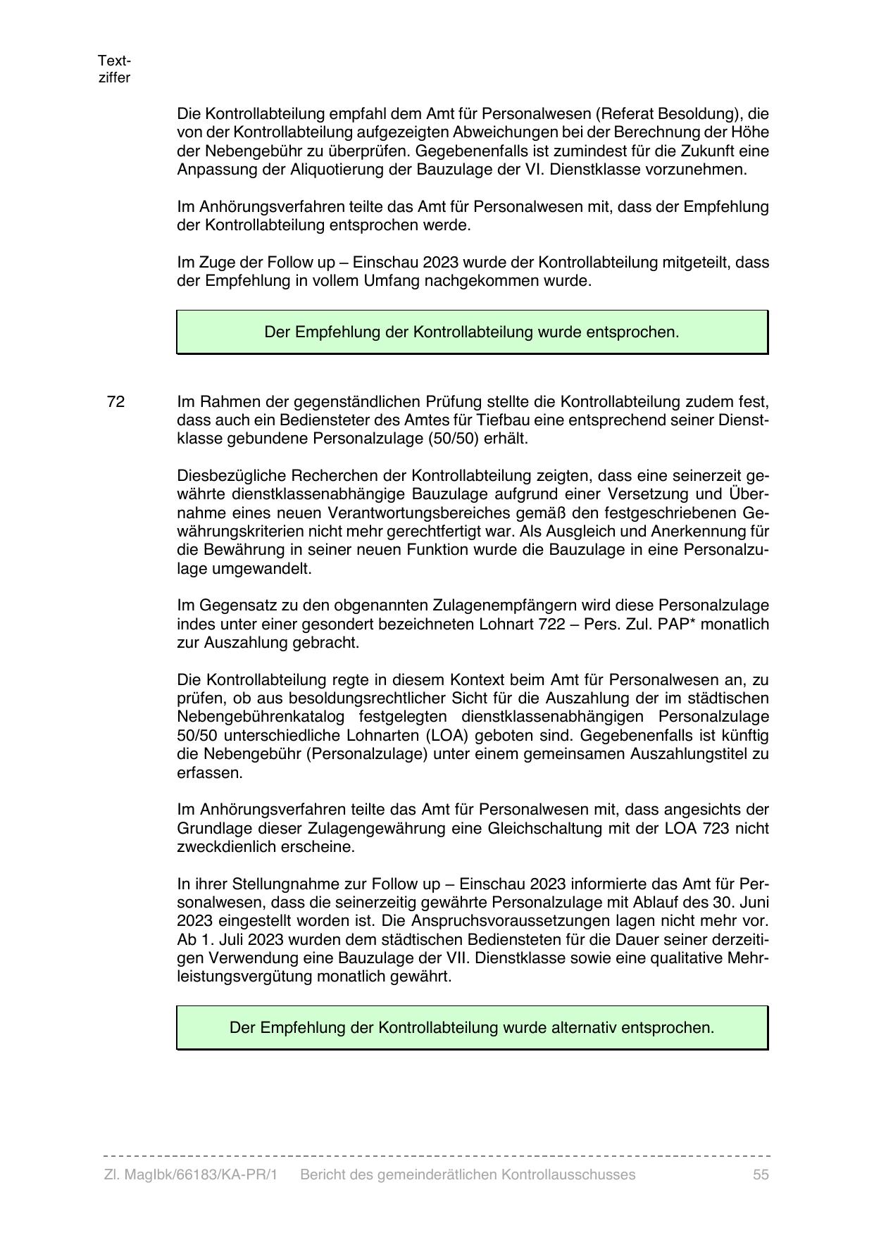 In ihrer Stellungnahme zur Follow up – Einschau 2023 informierte das Amt für Personalwesen, dass die seinerzeitig gewährte Personalzulage mit Ablauf des 30. Juni