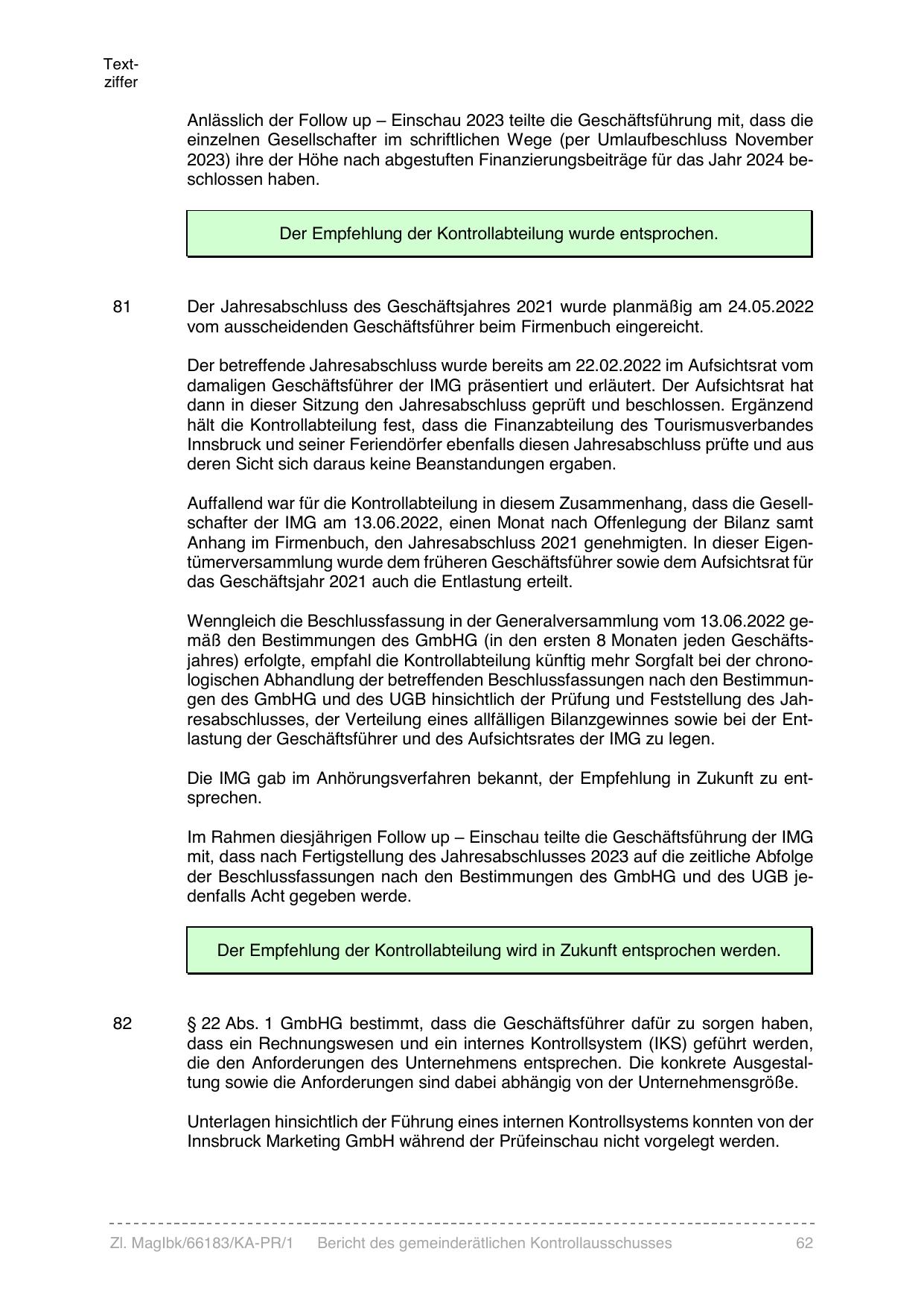 Wenngleich die Beschlussfassung in der Generalversammlung vom 13.06.2022 gemäß den Bestimmungen des GmbHG (in den ersten 8 Monaten jeden Geschäftsjahres) erfolgte, empfahl die Kontrollabteilung künftig mehr Sorgfalt bei der chronologischen Abhandlung der betreffenden Beschlussfassungen nach den Bestimmungen des GmbHG und des UGB hinsichtlich der Prüfung und Feststellung des Jahresabschlusses, der Verteilung eines allfälligen Bilanzgewinnes sowie bei der Entlastung der Geschäftsführer und des Aufsichtsrates der IMG zu legen.