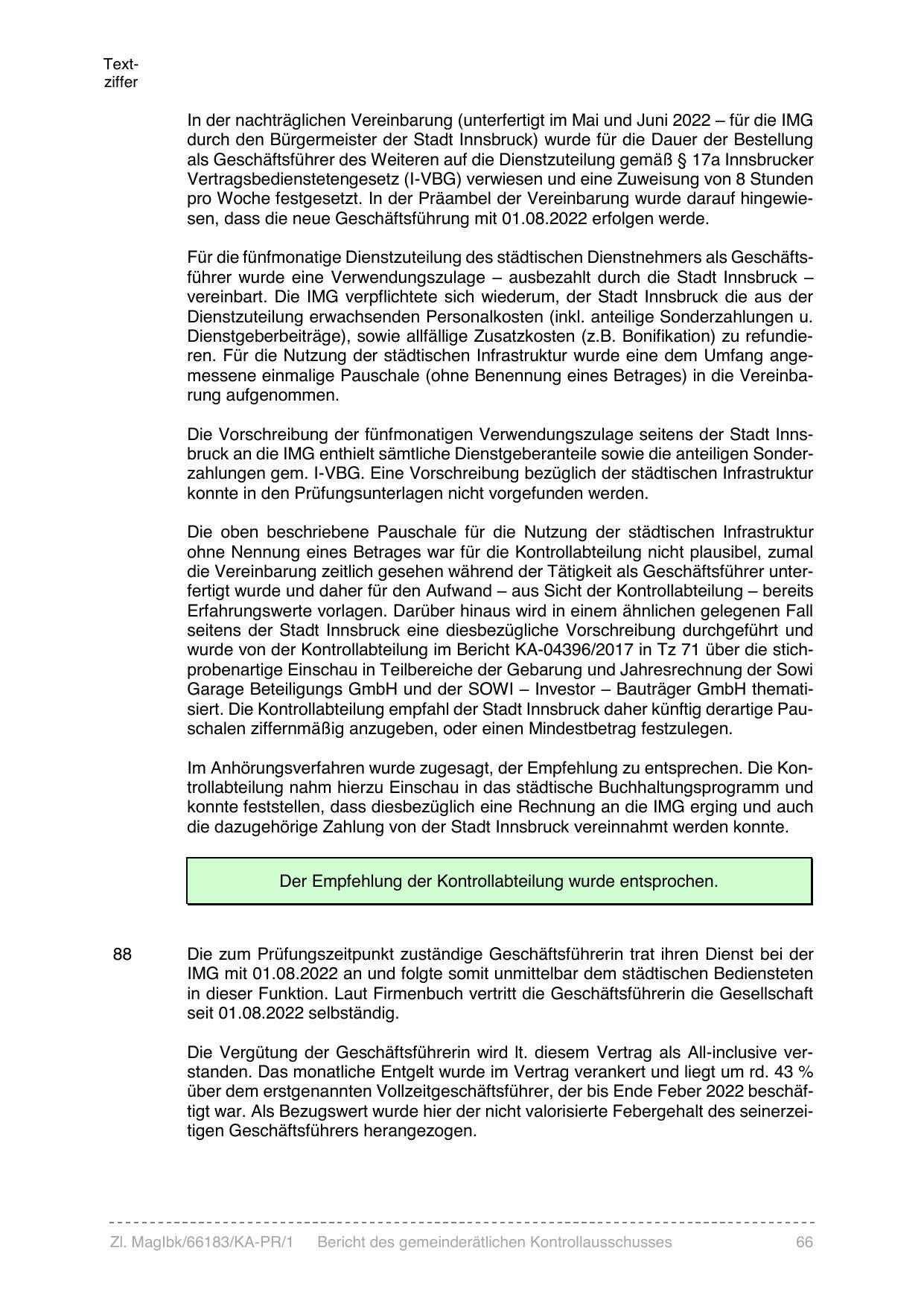 Garage Beteiligungs GmbH und der SOWI – Investor – Bauträger GmbH thematisiert. Die Kontrollabteilung empfahl der Stadt Innsbruck daher künftig derartige Pauschalen ziffernmäßig anzugeben, oder einen Mindestbetrag festzulegen.
