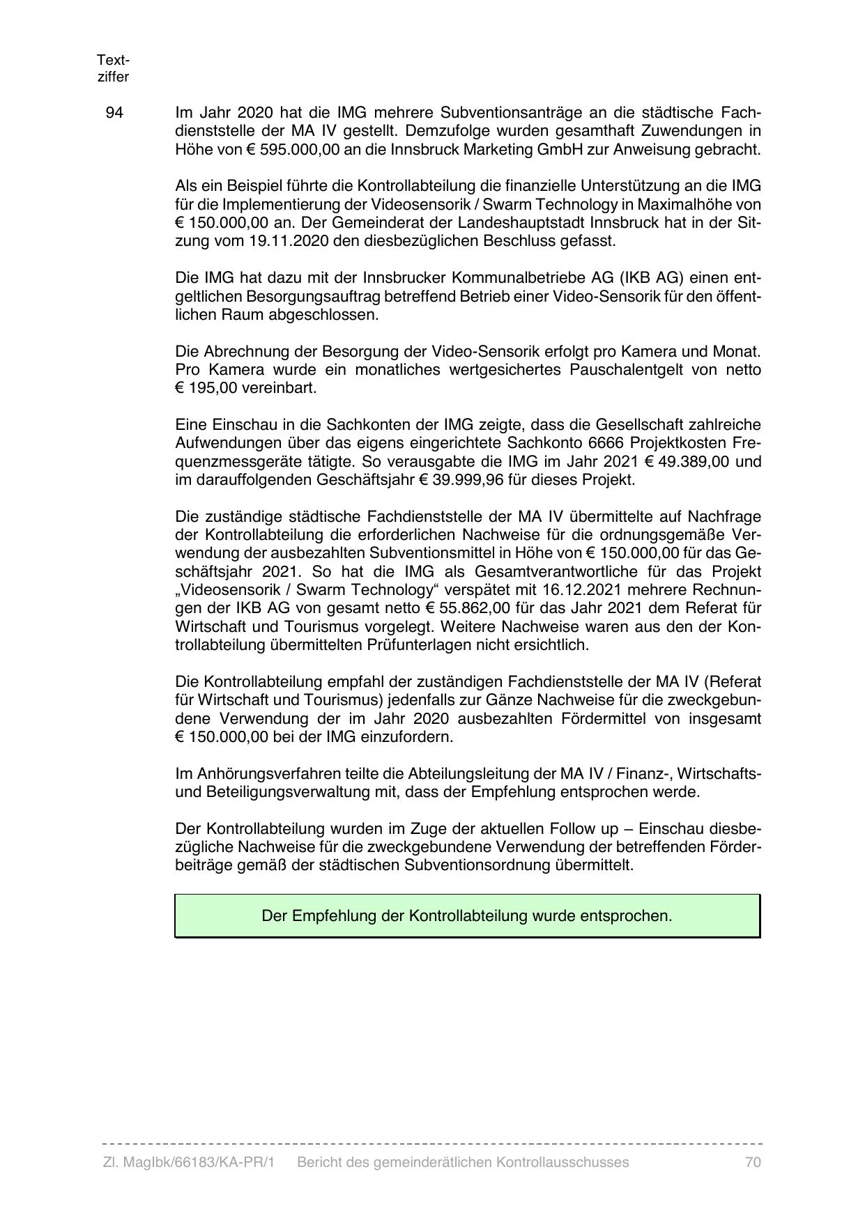 Höhe von € 595.000,00 an die Innsbruck Marketing GmbH zur Anweisung gebracht.