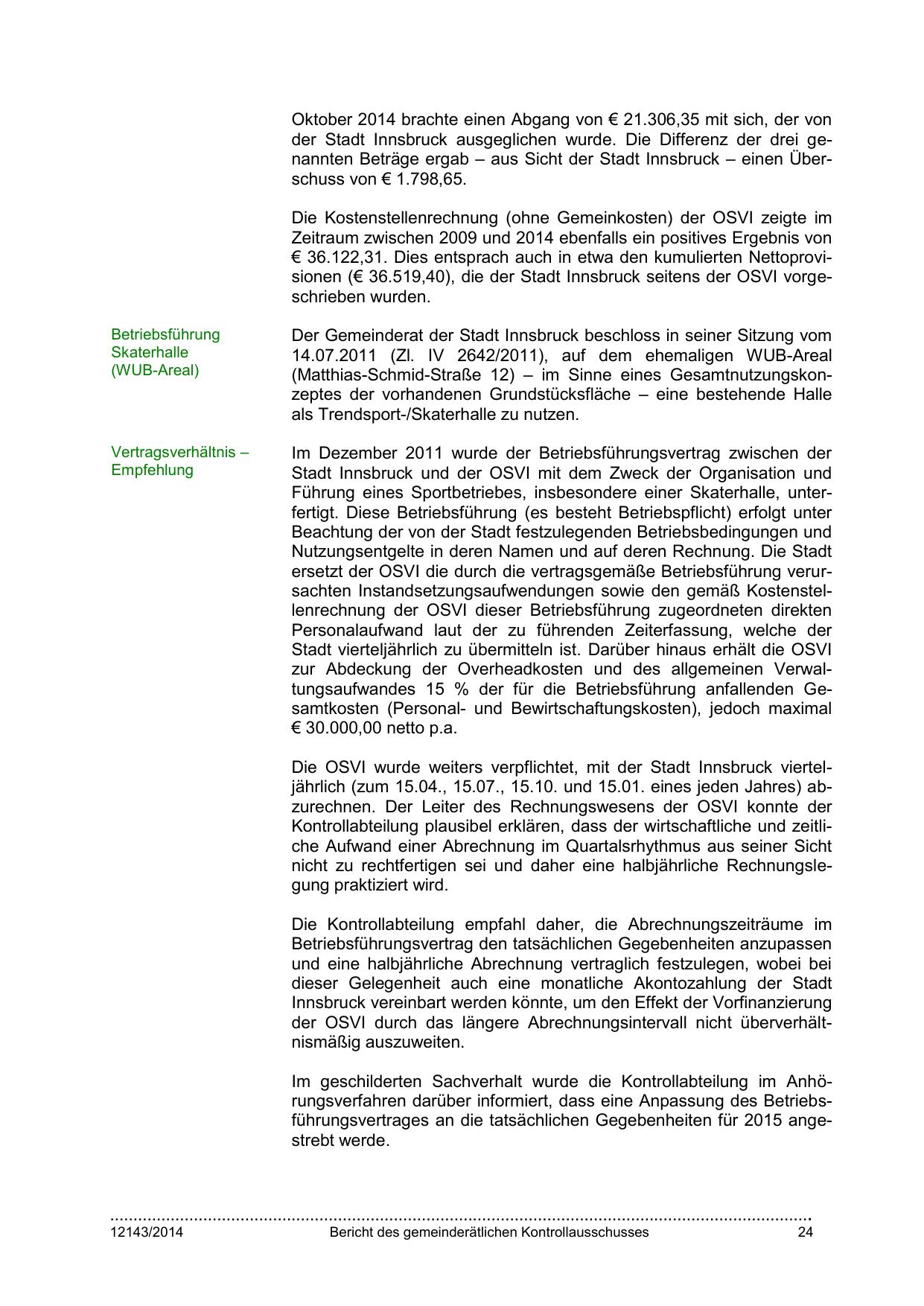 Die OSVI wurde weiters verpflichtet, mit der Stadt Innsbruck vierteljährlich (zum 15.04., 15.07., 15.10. und 15.01. eines jeden Jahres) abzurechnen. Der Leiter des Rechnungswesens der OSVI konnte der