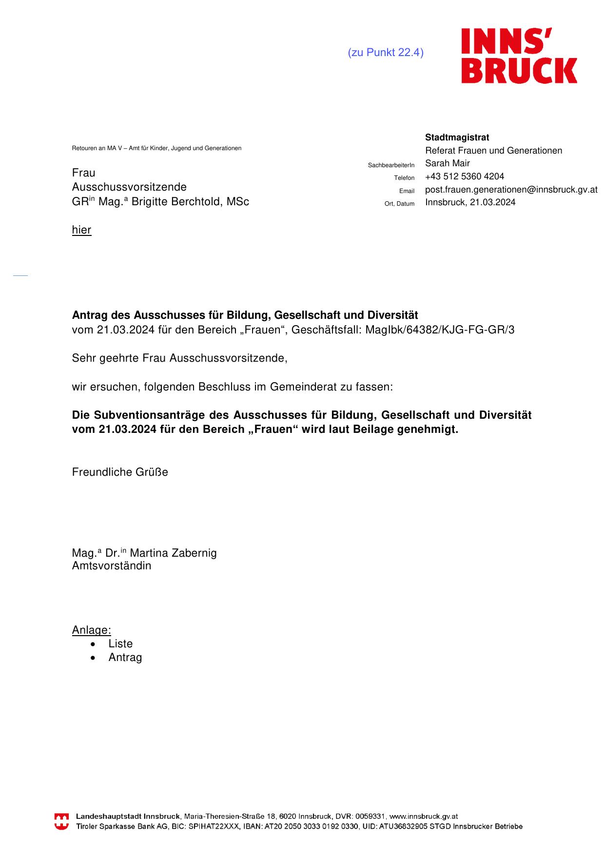 vom 21.03.2024 für den Bereich „Frauen“, Geschäftsfall: MagIbk/64382/KJG-FG-GR/3