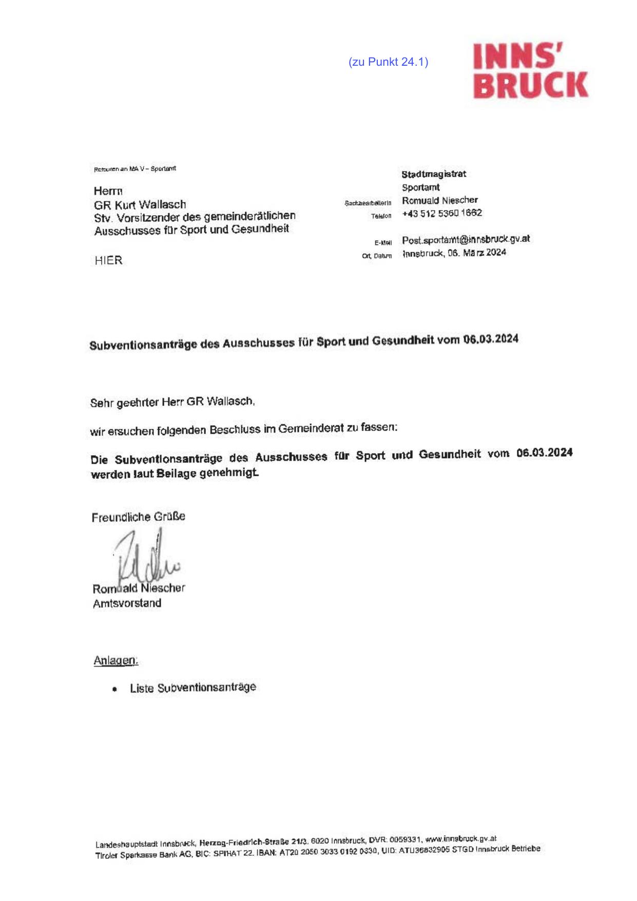 Subventionsanträge d&S Ausschusses für Sport und Gesundheit vom os.oa.2024