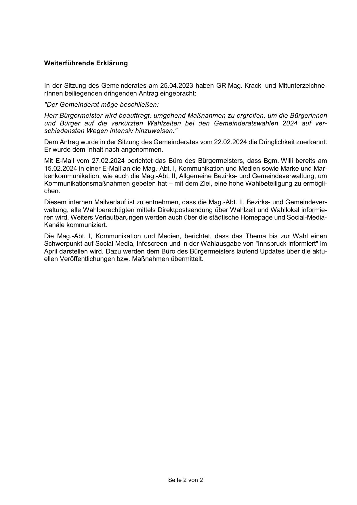 In der Sitzung des Gemeinderates am 25.04.2023 haben GR Mag. Krackl und MitunterzeichnerInnen beiliegenden dringenden Antrag eingebracht: