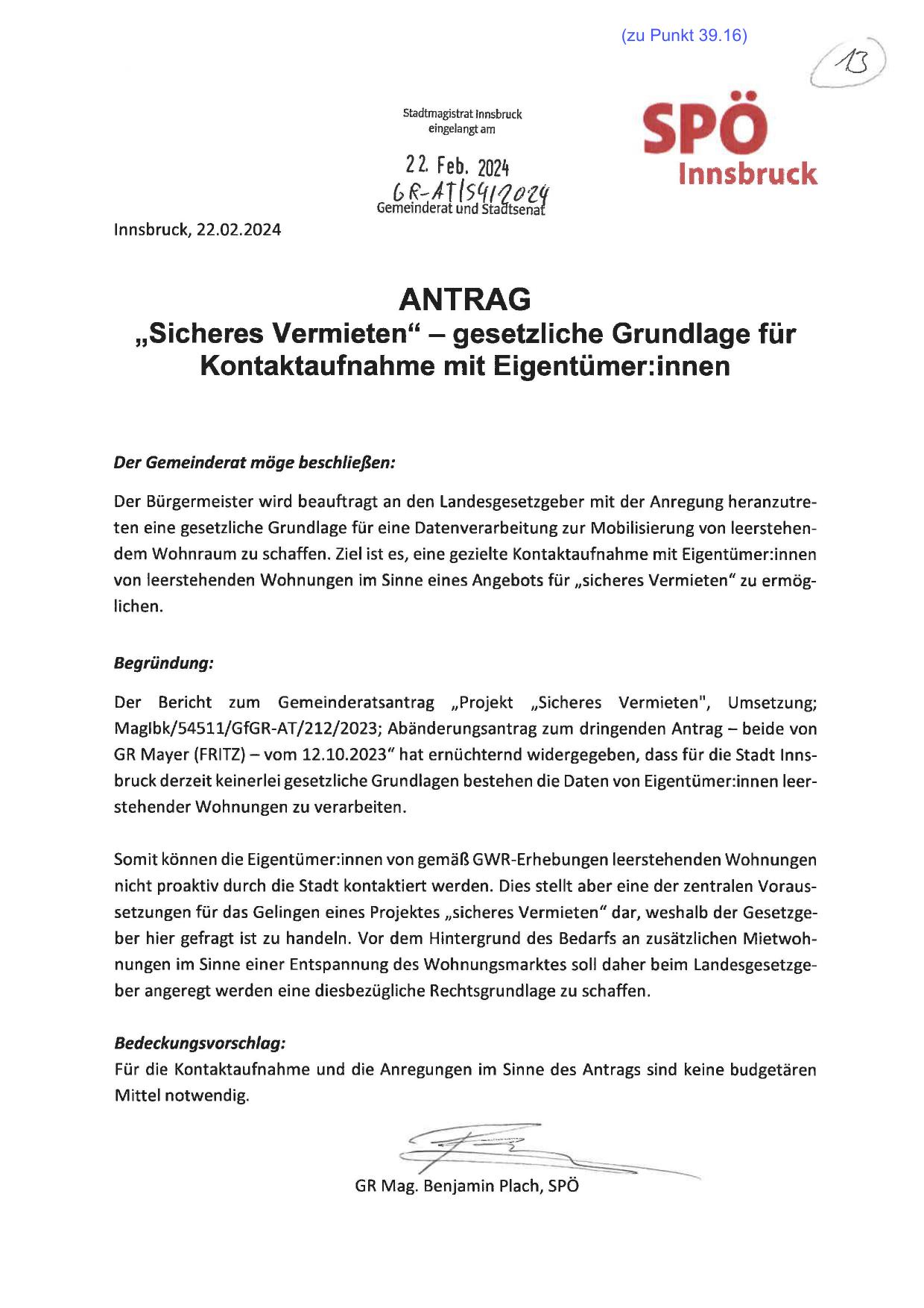 Der Bürgermeister wird beauftragt an den Landesgesetzgeber mit der Anregung heranzutreten eine gesetzliche Grundlage für eine Datenverarbeitung zur Mobilisierung von leerstehendem Wohnraum zu schaffen. Ziel ist es, eine gezielte Kontaktaufnahme mit Eigentümer:innen