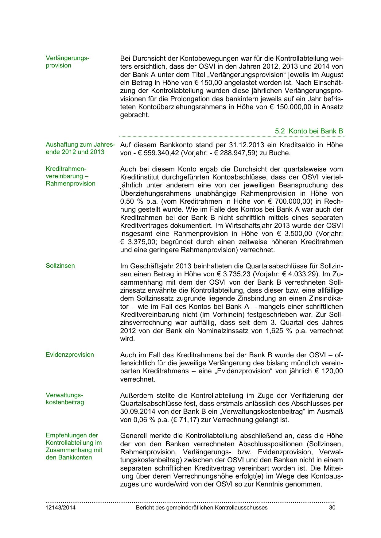 Im Geschäftsjahr 2013 beinhalteten die Quartalsabschlüsse für Sollzinsen einen Betrag in Höhe von € 3.735,23 (Vorjahr: € 4.033,29). Im Zusammenhang mit dem der OSVI von der Bank B verrechneten Sollzinssatz erwähnte die Kontrollabteilung, dass dieser bzw. eine allfällige