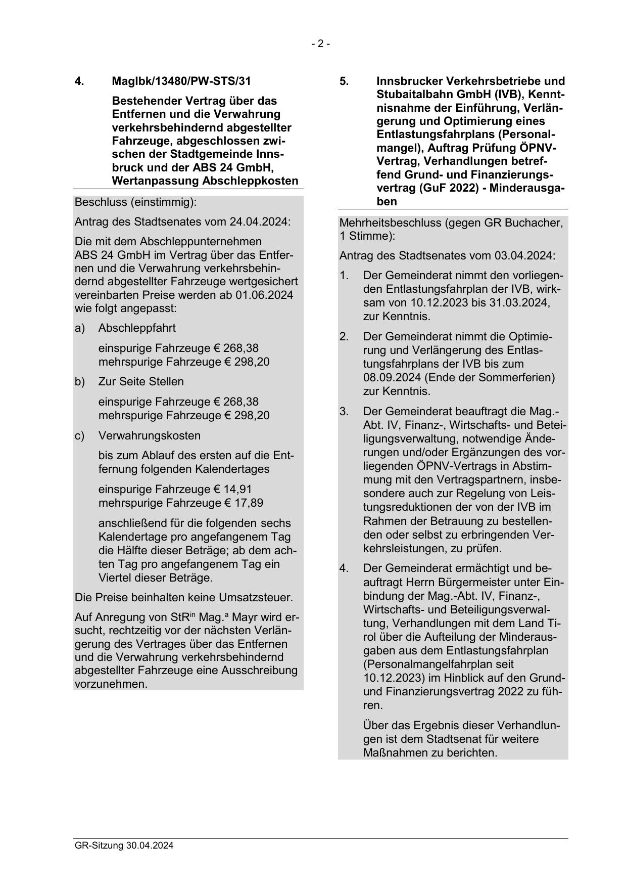 Der Gemeinderat beauftragt die Mag.Abt. IV, Finanz-, Wirtschafts- und Beteiligungsverwaltung, notwendige Änderungen und/oder Ergänzungen des vorliegenden ÖPNV-Vertrags in Abstimmung mit den Vertragspartnern, insbesondere auch zur Regelung von Leistungsreduktionen der von der IVB im