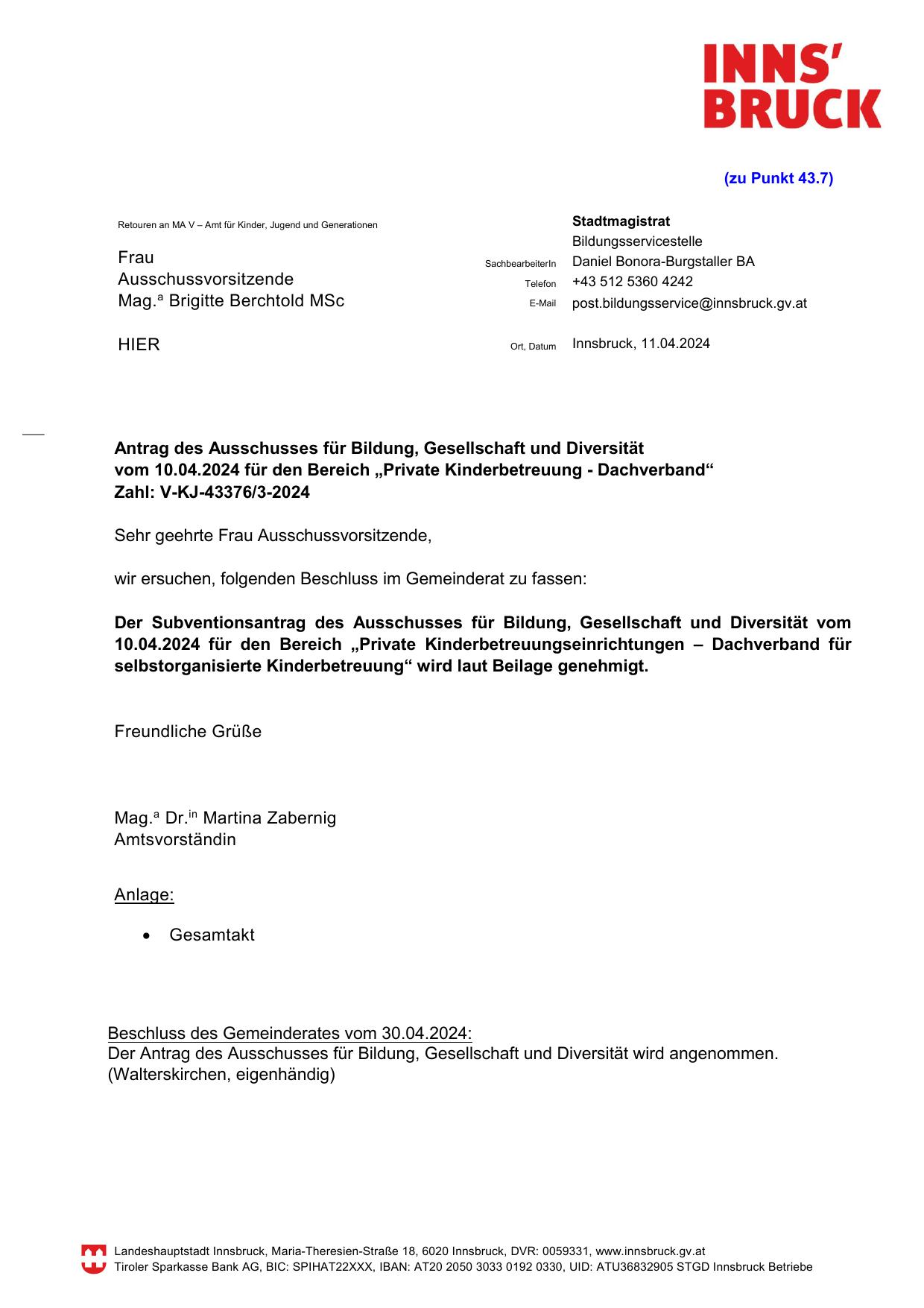Beschluss des Gemeinderates vom 30.04.2024: