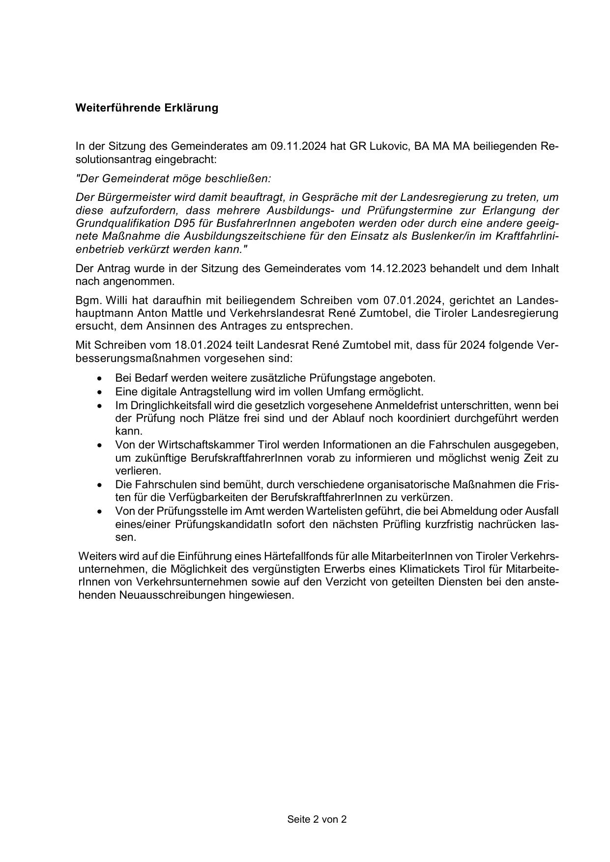Bgm. Willi hat daraufhin mit beiliegendem Schreiben vom 07.01.2024, gerichtet an Landeshauptmann Anton Mattle und Verkehrslandesrat René Zumtobel, die Tiroler Landesregierung