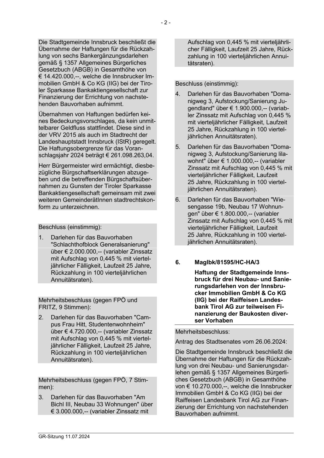 Haftung der Stadtgemeinde Innsbruck für drei Neubau- und Sanierungsdarlehen von der Innsbrucker Immobilien GmbH & Co KG