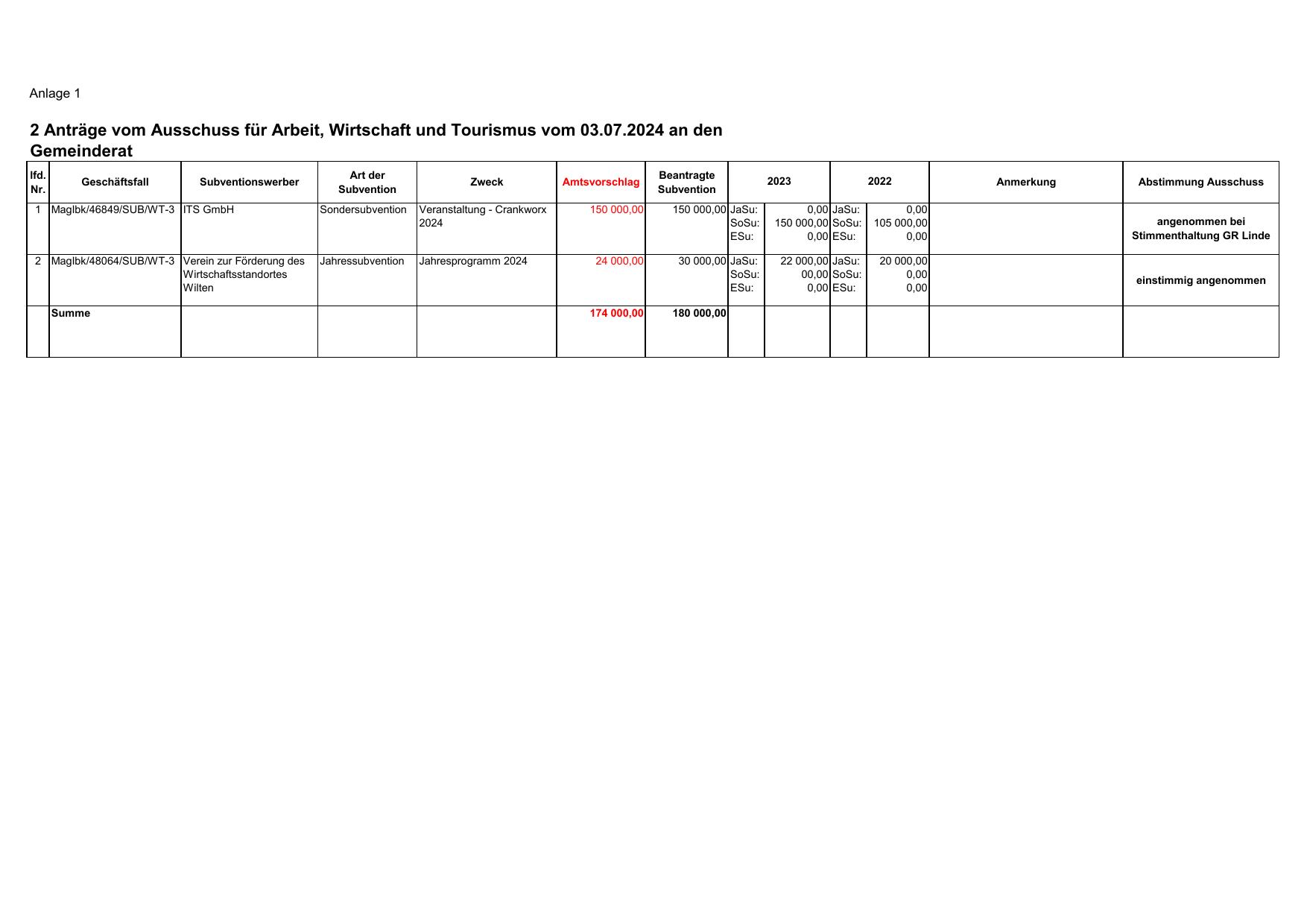 2 Anträge vom Ausschuss für Arbeit, Wirtschaft und Tourismus vom 03.07.2024 an den