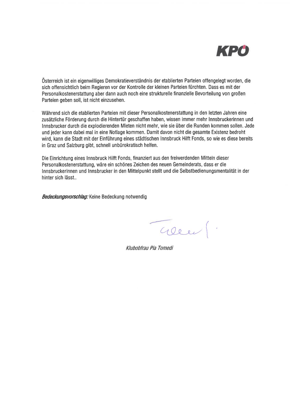 Die Einrichtung eines Innsbruck Hilft Fonds, finanziert aus den treiwerdenden Mitteln dieser