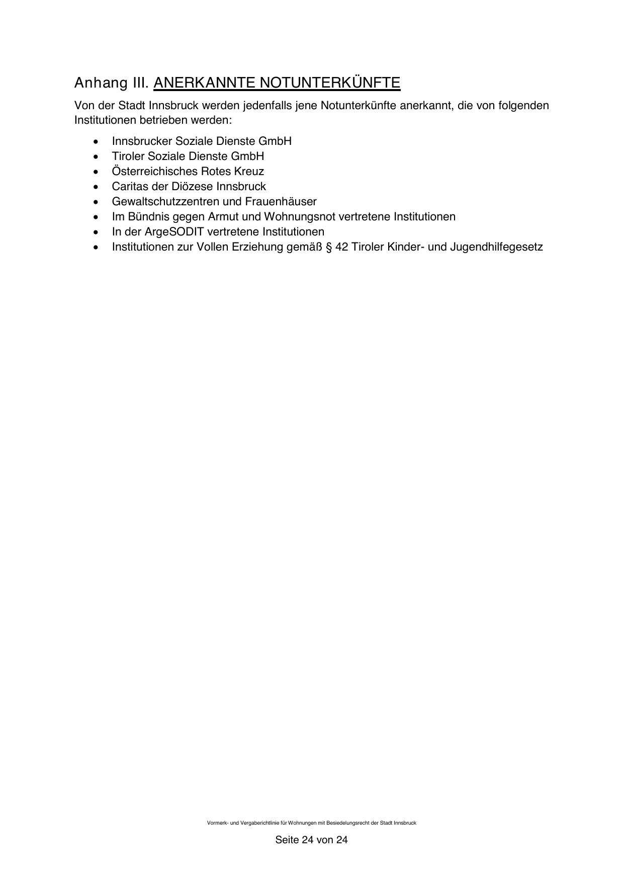 Von der Stadt Innsbruck werden jedenfalls jene Notunterkünfte anerkannt, die von folgenden