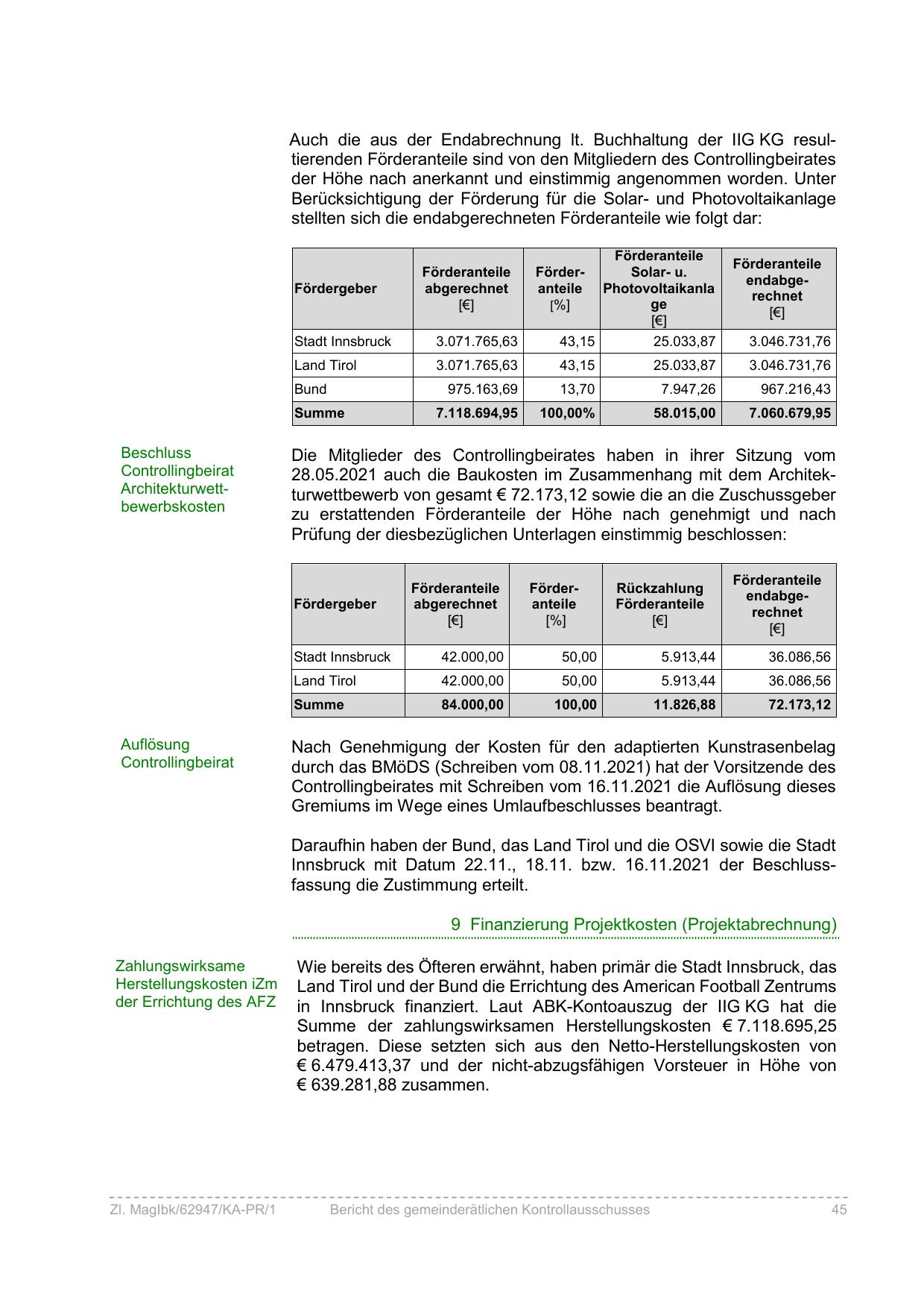 Auch die aus der Endabrechnung lt. Buchhaltung der IIG KG resultierenden Förderanteile sind von den Mitgliedern des Controllingbeirates