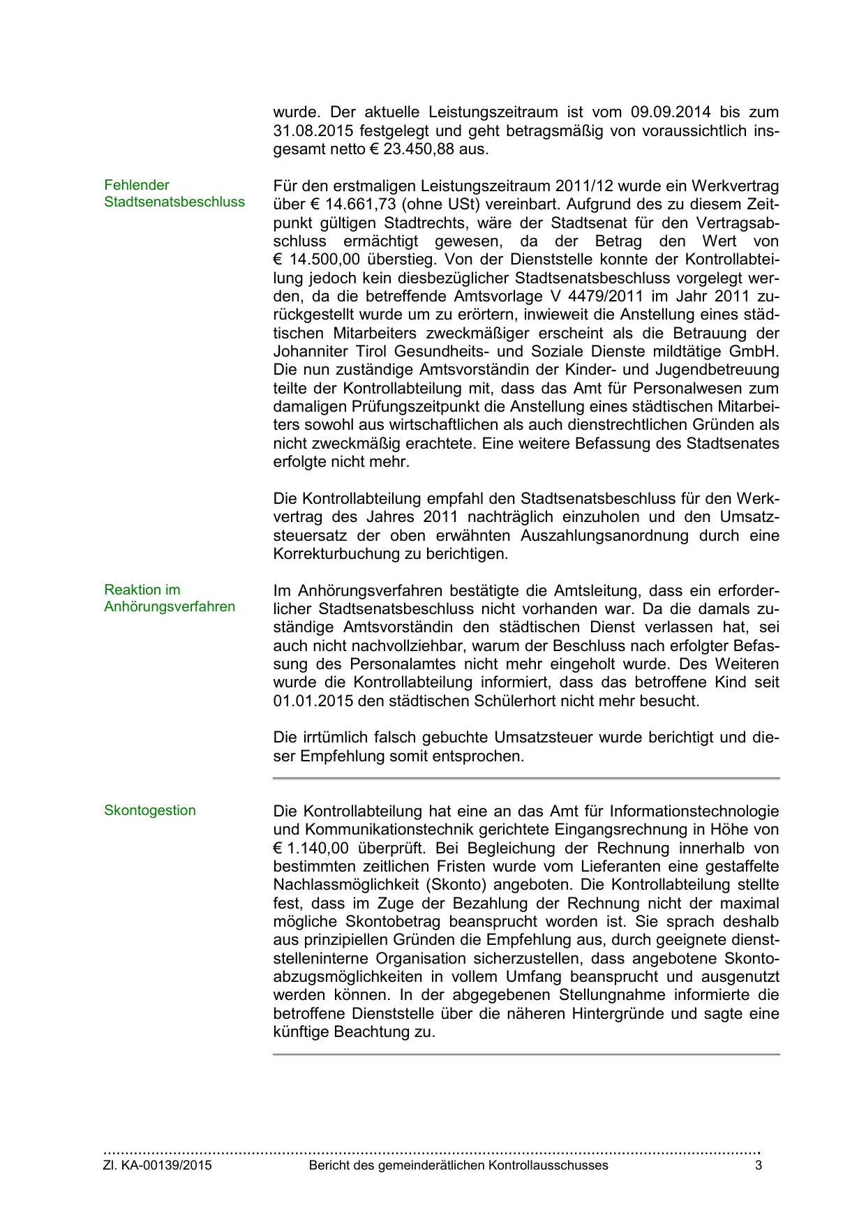 über € 14.661,73 (ohne USt) vereinbart. Aufgrund des zu diesem Zeitpunkt gültigen Stadtrechts, wäre der Stadtsenat für den Vertragsabschluss ermächtigt gewesen, da der Betrag den Wert von