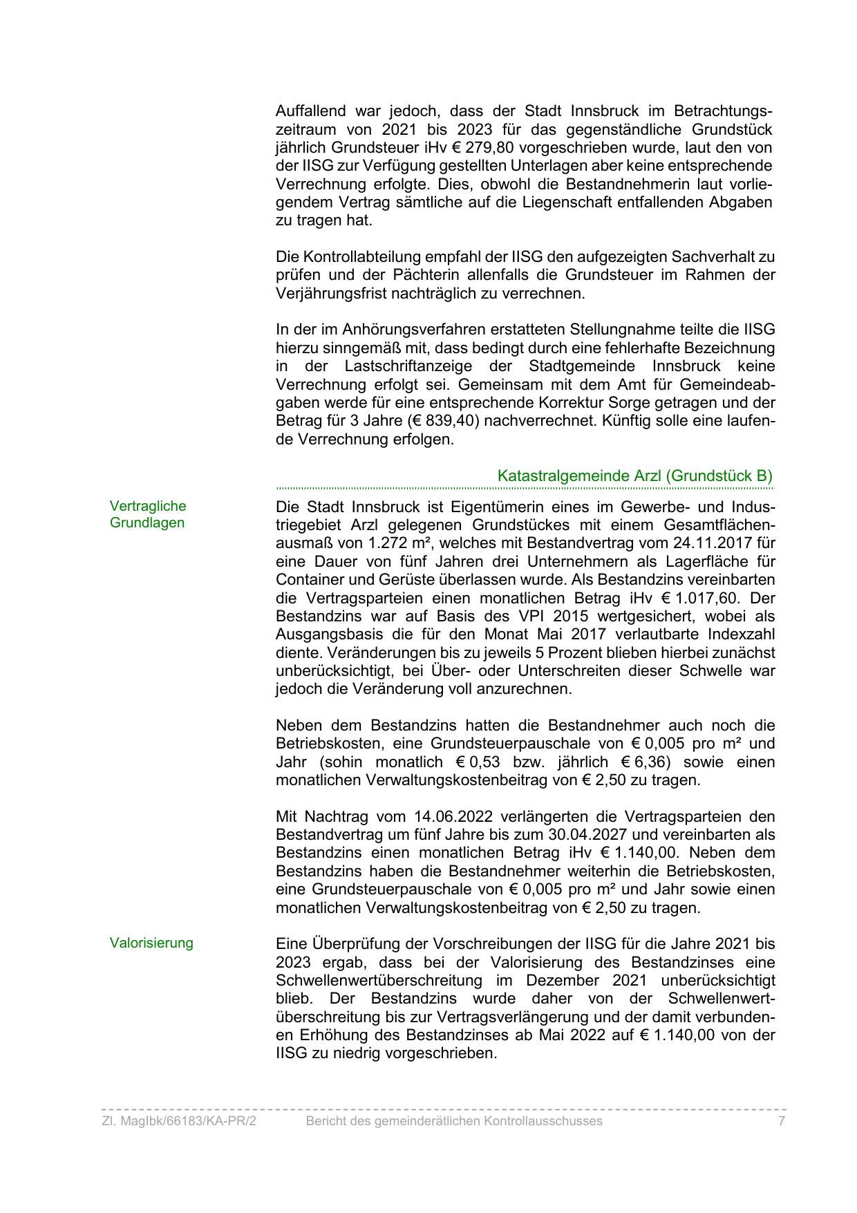 Die Stadt Innsbruck ist Eigentümerin eines im Gewerbe- und Industriegebiet Arzl gelegenen Grundstückes mit einem Gesamtflächenausmaß von 1.272 m², welches mit Bestandvertrag vom 24.11.2017 für