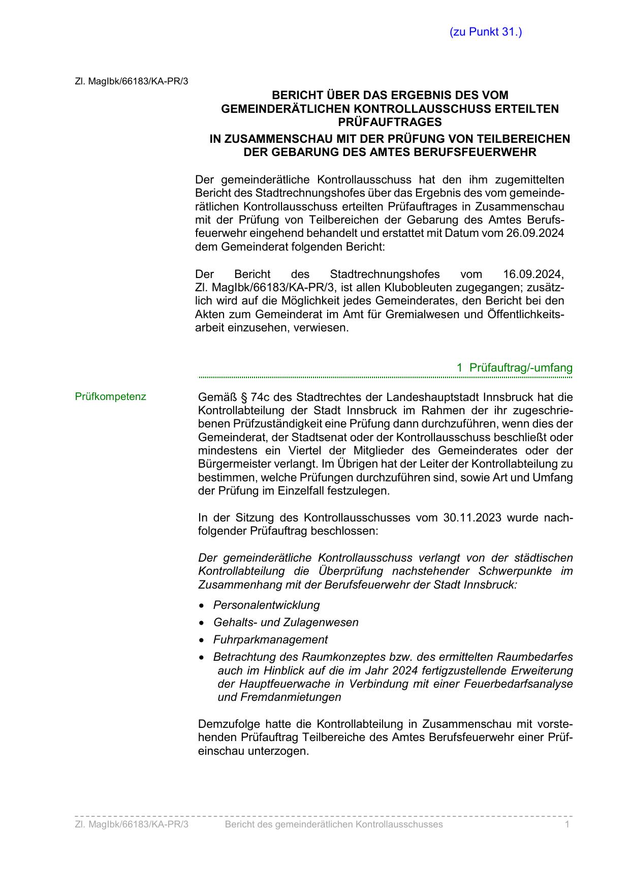 mit der Prüfung von Teilbereichen der Gebarung des Amtes Berufsfeuerwehr eingehend behandelt und erstattet mit Datum vom 26.09.2024
