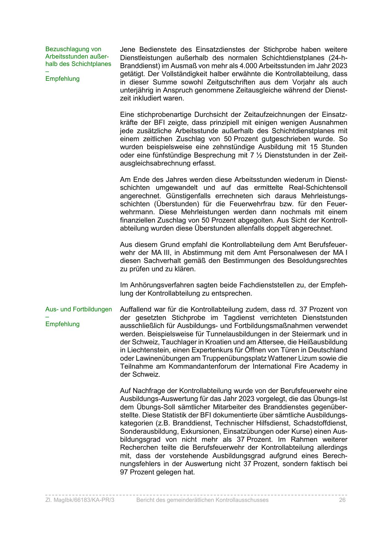 Aus diesem Grund empfahl die Kontrollabteilung dem Amt Berufsfeuerwehr der MA III, in Abstimmung mit dem Amt Personalwesen der MA I