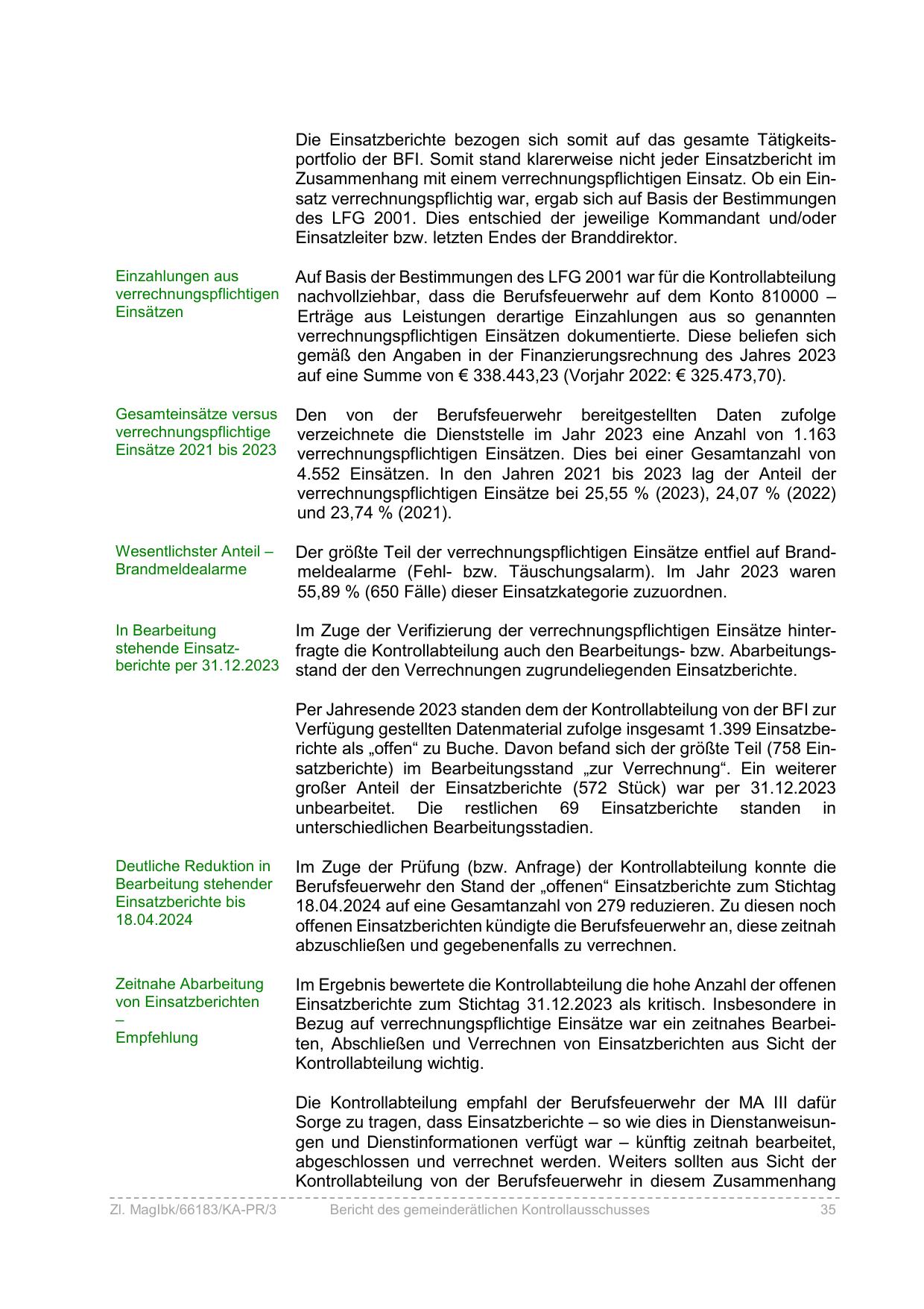 Im Zuge der Verifizierung der verrechnungspflichtigen Einsätze hinterfragte die Kontrollabteilung auch den Bearbeitungs- bzw. Abarbeitungsstand der den Verrechnungen zugrundeliegenden Einsatzberichte.