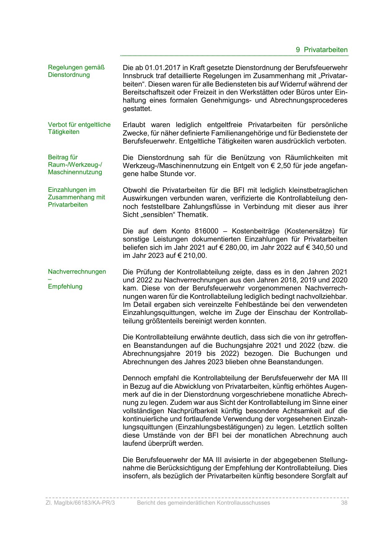 in Bezug auf die Abwicklung von Privatarbeiten, künftig erhöhtes Augenmerk auf die in der Dienstordnung vorgeschriebene monatliche Abrechnung zu legen. Zudem war aus Sicht der Kontrollabteilung im Sinne einer