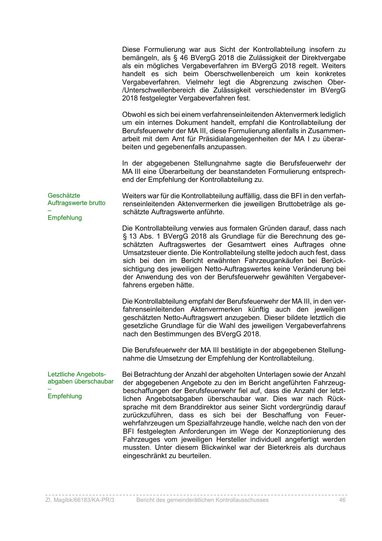 Die Kontrollabteilung empfahl der Berufsfeuerwehr der MA III, in den verfahrenseinleitenden Aktenvermerken künftig auch den jeweiligen
