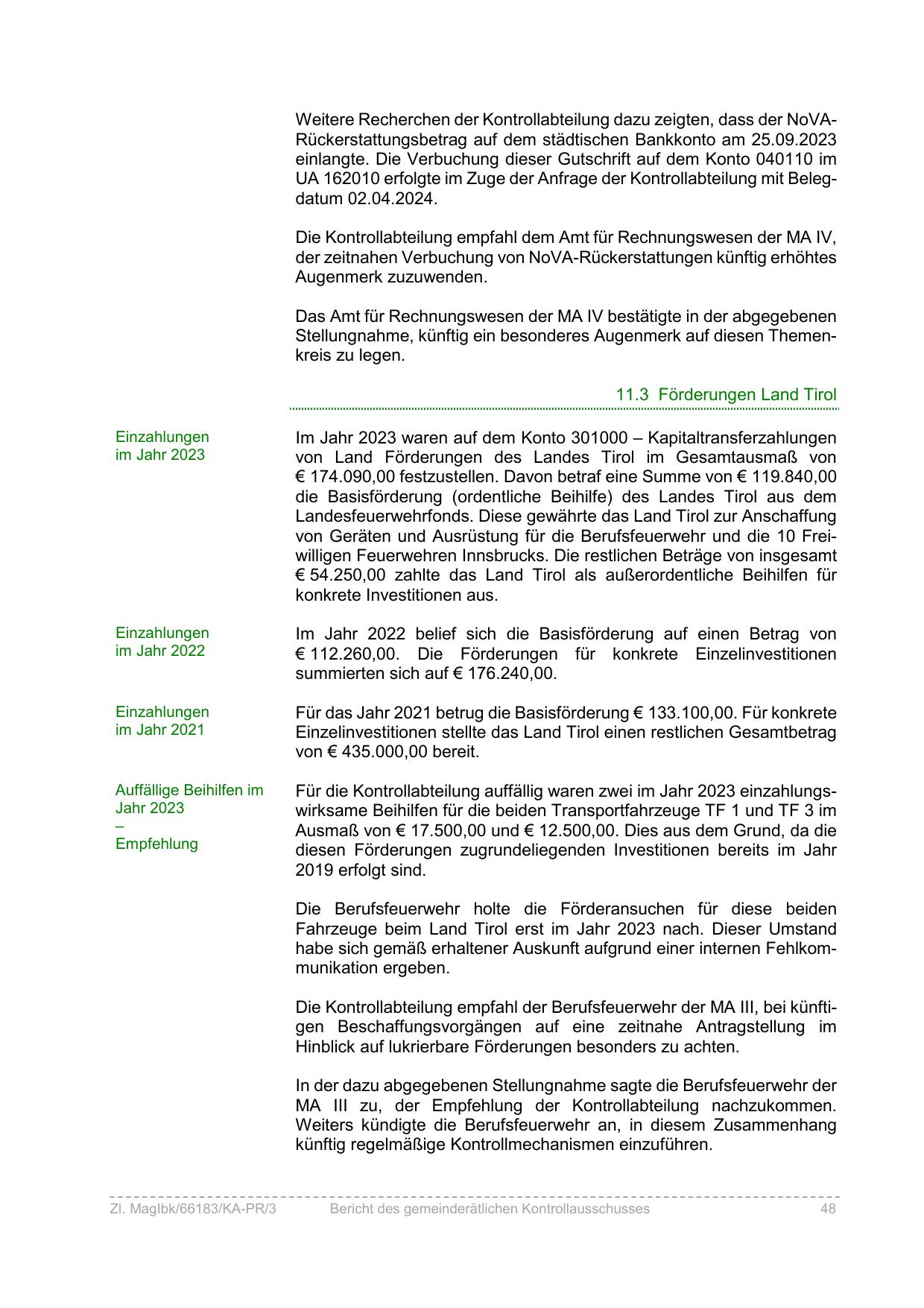 Für die Kontrollabteilung auffällig waren zwei im Jahr 2023 einzahlungswirksame Beihilfen für die beiden Transportfahrzeuge TF 1 und TF 3 im