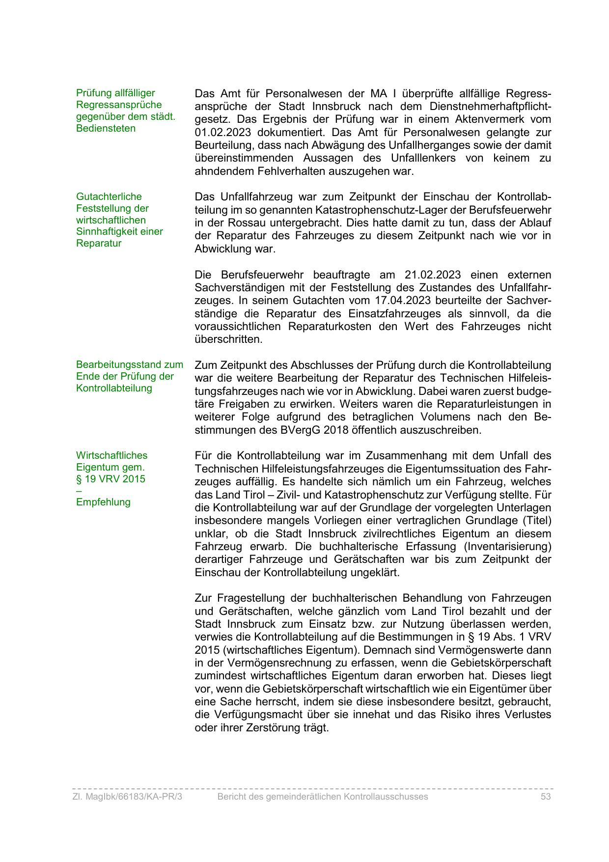 Das Amt für Personalwesen der MA I überprüfte allfällige Regressansprüche der Stadt Innsbruck nach dem Dienstnehmerhaftpflichtgesetz. Das Ergebnis der Prüfung war in einem Aktenvermerk vom
