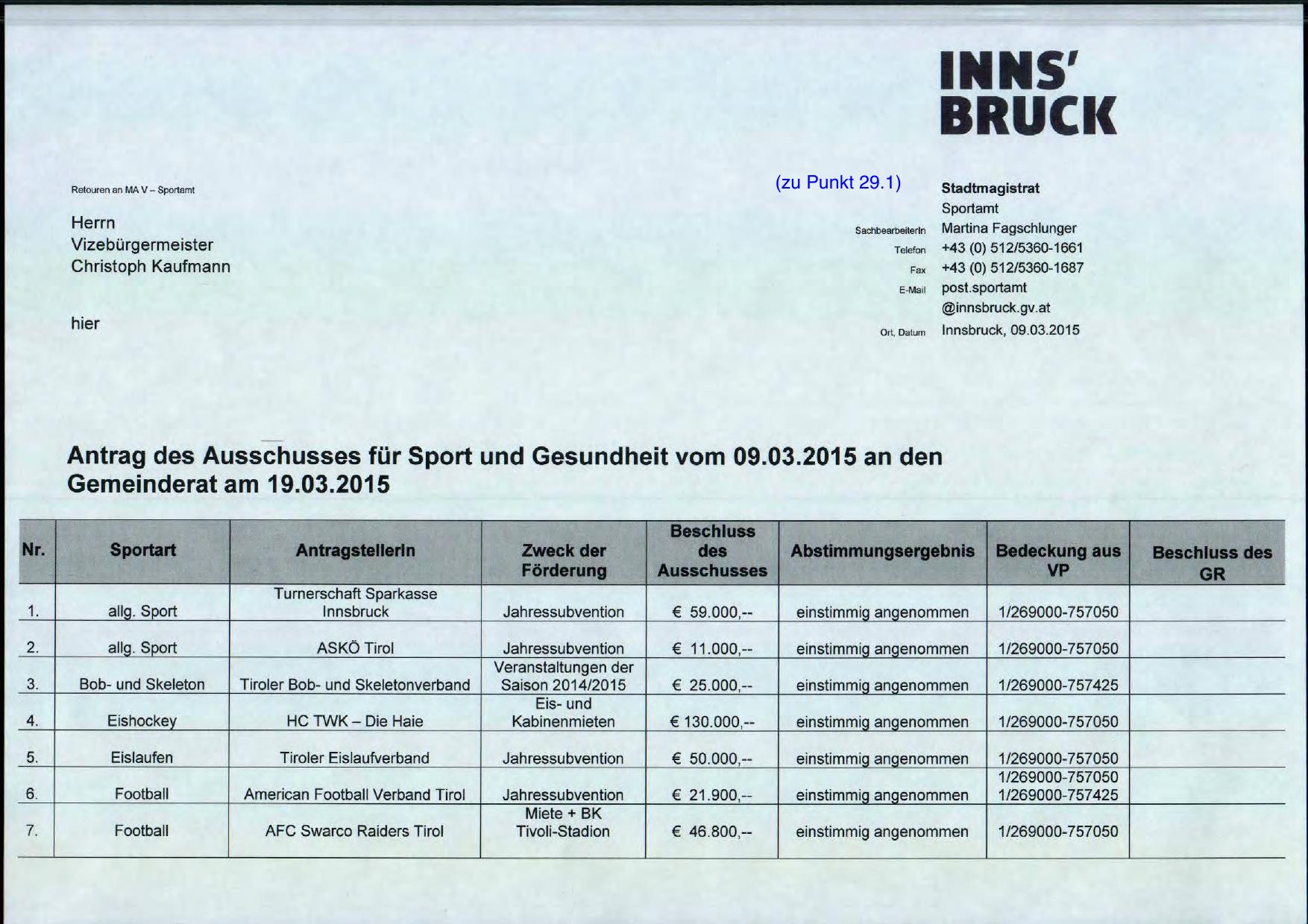 Antrag des Ausschusses für Sport und Gesundheit vom 09.03.2015 an den