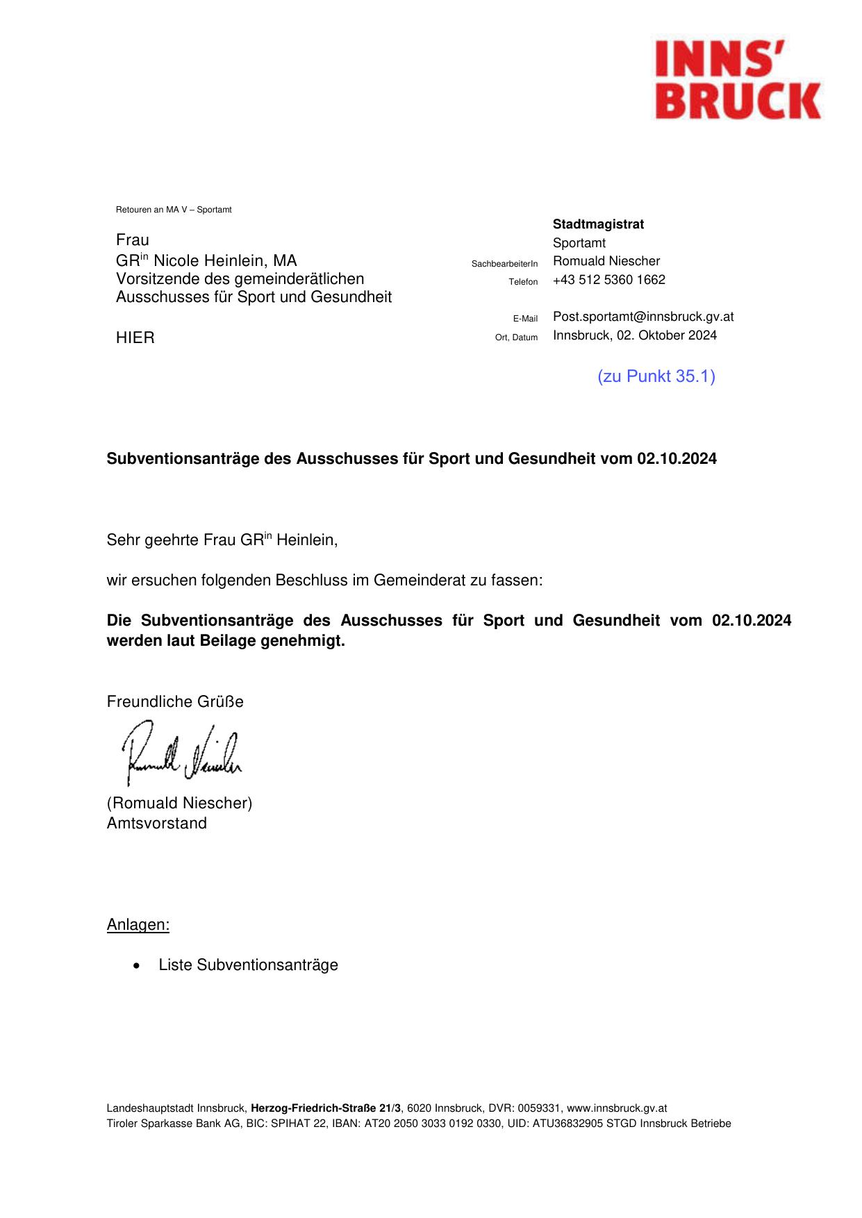 Die Subventionsanträge des Ausschusses für Sport und Gesundheit vom 02.10.2024