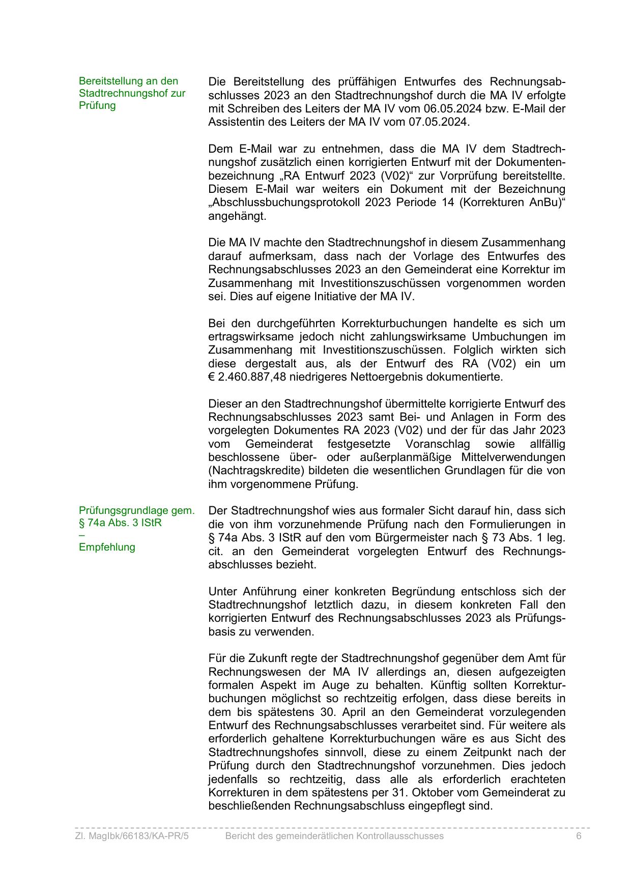 Die Bereitstellung des prüffähigen Entwurfes des Rechnungsabschlusses 2023 an den Stadtrechnungshof durch die MA IV erfolgte