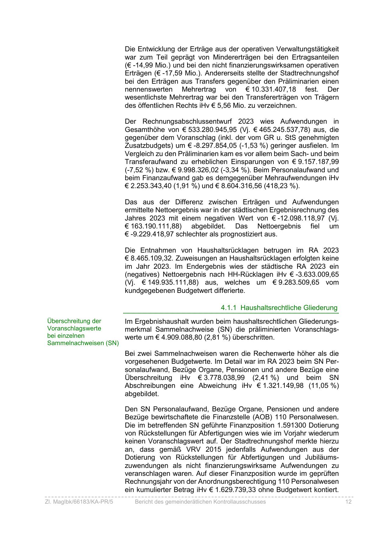vorgesehenen Budgetwerte. Im Detail war im RA 2023 beim SN Personalaufwand, Bezüge Organe, Pensionen und andere Bezüge eine