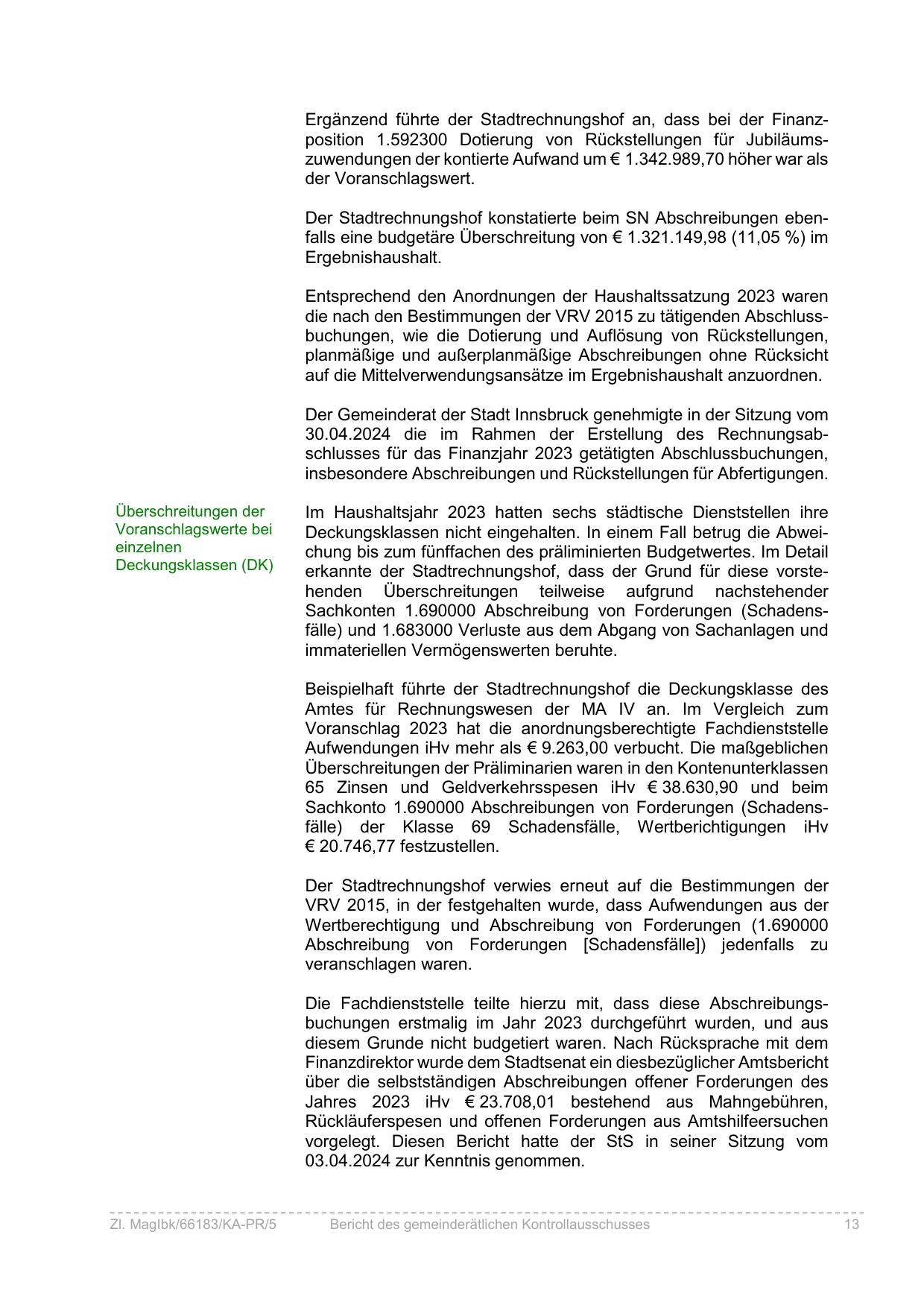 Der Stadtrechnungshof konstatierte beim SN Abschreibungen ebenfalls eine budgetäre Überschreitung von € 1.321.149,98 (11,05 %) im