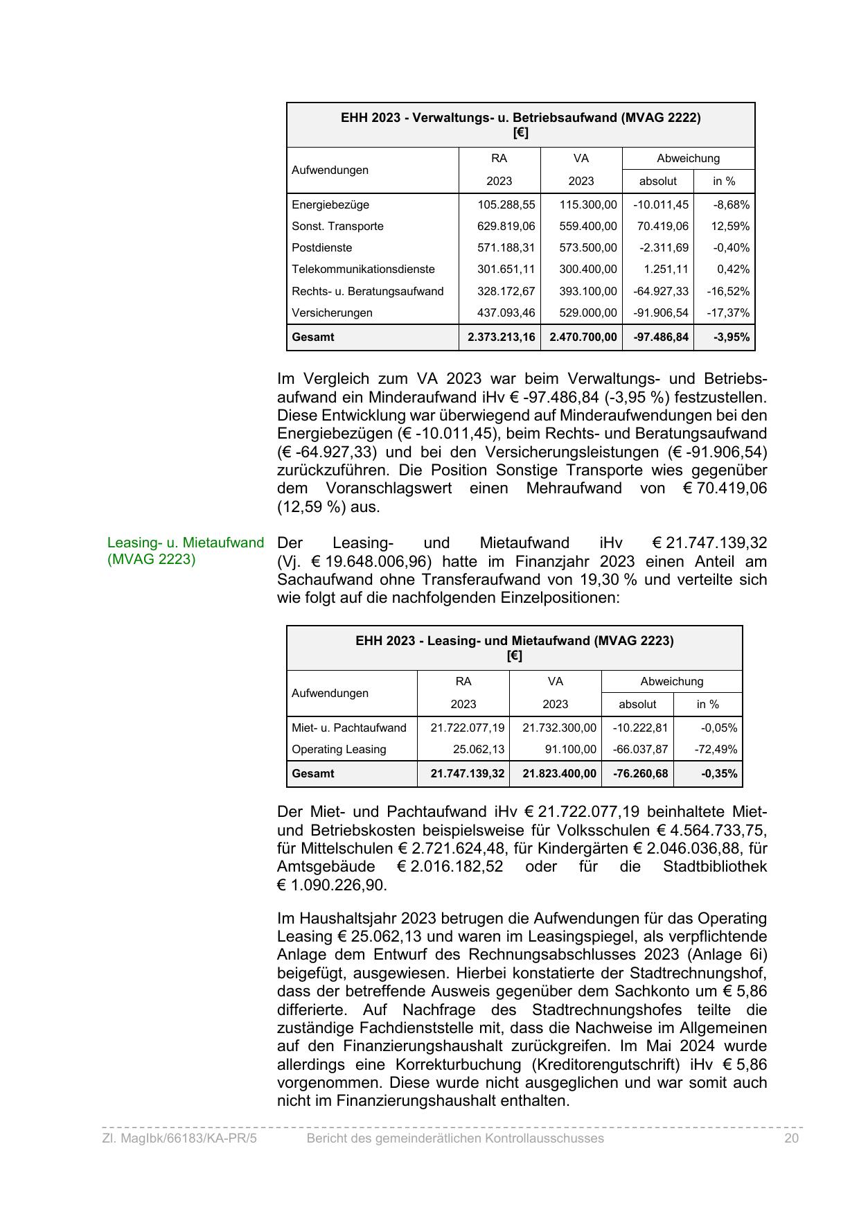 Energiebezügen (€ -10.011,45), beim Rechts- und Beratungsaufwand