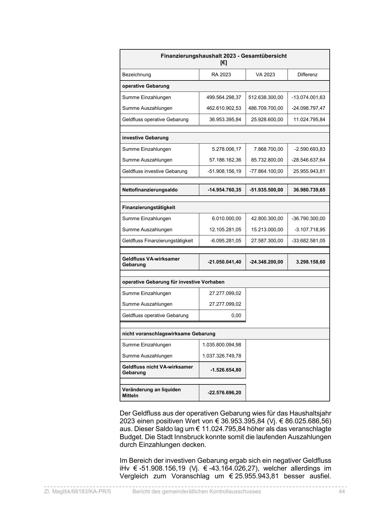 Der Geldfluss aus der operativen Gebarung wies für das Haushaltsjahr