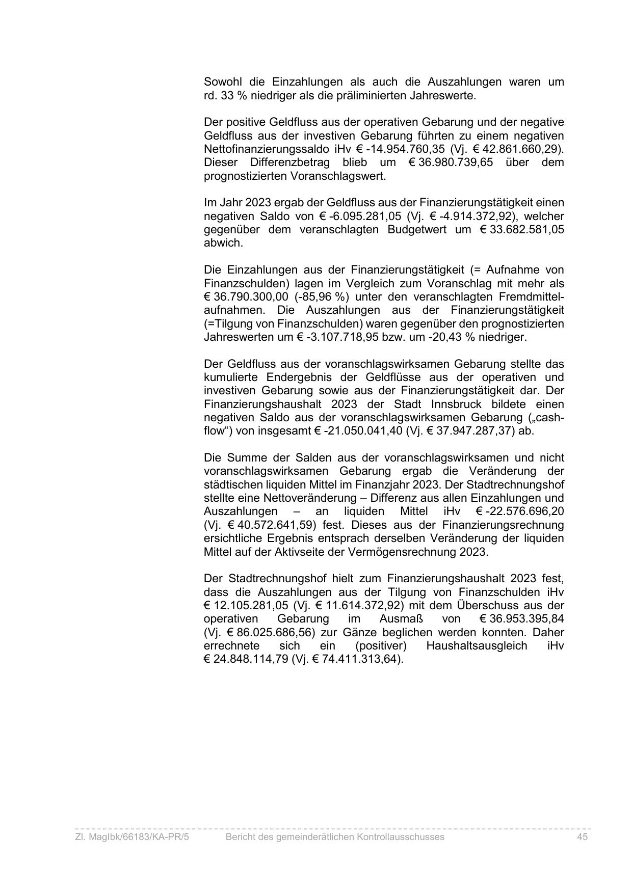 negativen Saldo aus der voranschlagswirksamen Gebarung („cashflow“) von insgesamt € -21.050.041,40 (Vj. € 37.947.287,37) ab.