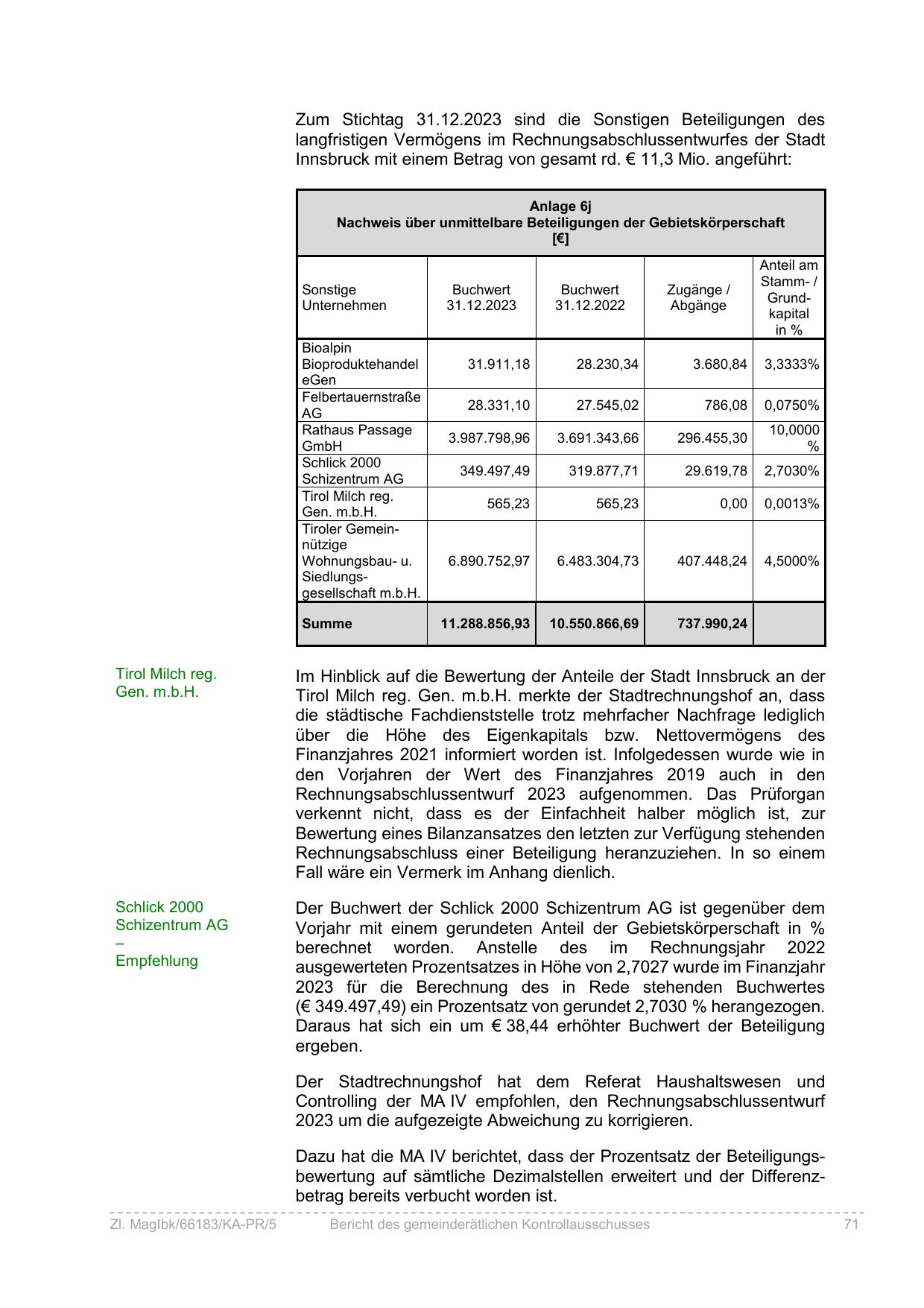 Im Hinblick auf die Bewertung der Anteile der Stadt Innsbruck an der