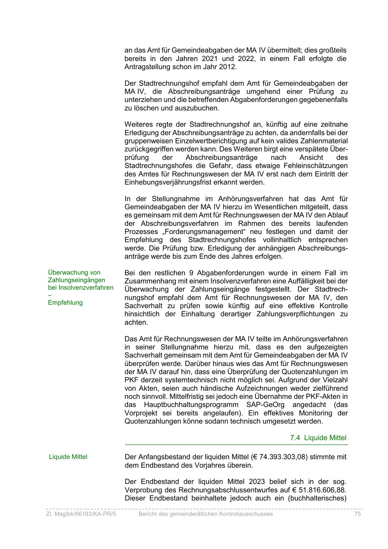 Überwachung der Zahlungseingänge festgestellt. Der Stadtrechnungshof empfahl dem Amt für Rechnungswesen der MA IV, den