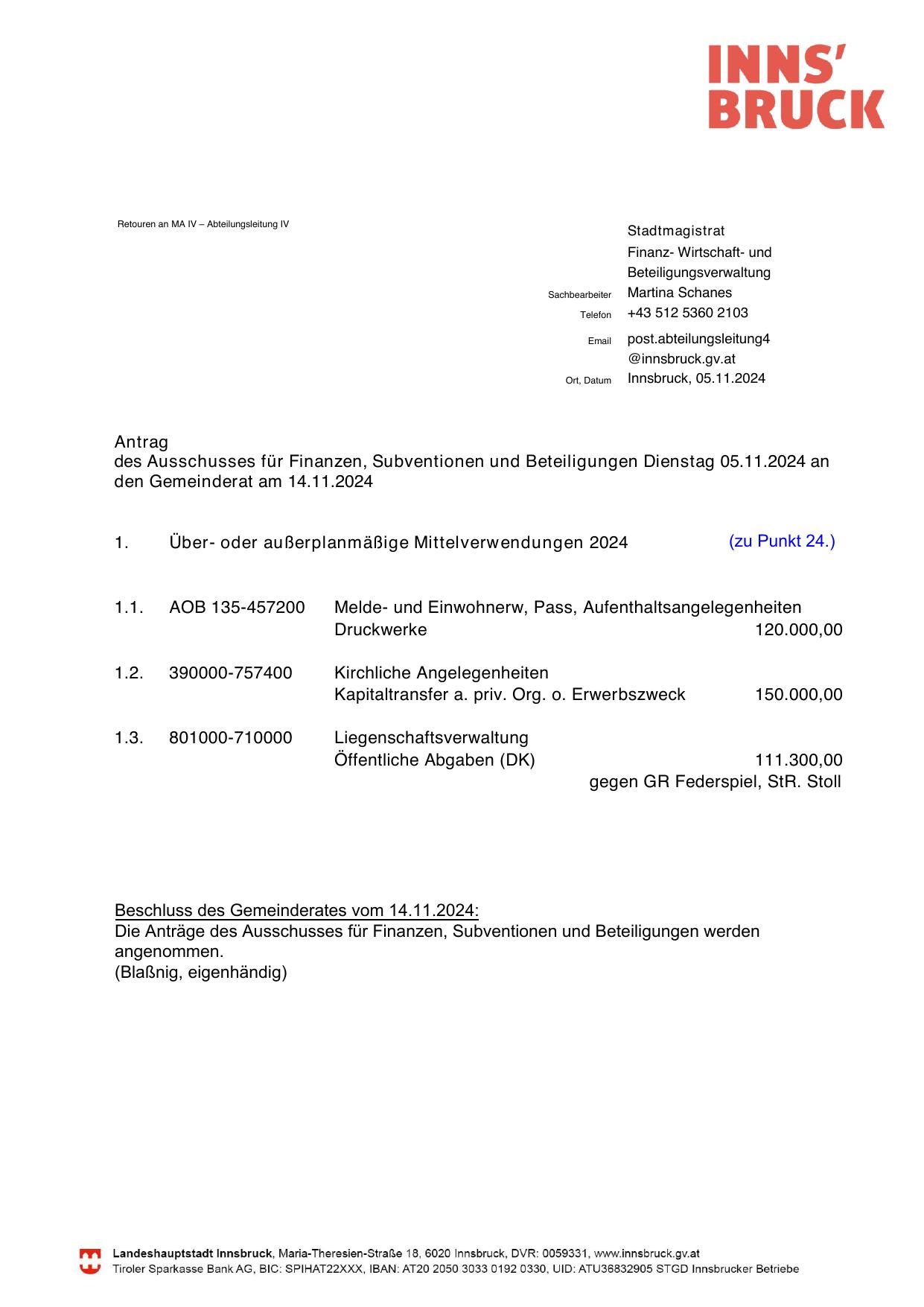 Über- oder außerplanmäßige Mittelverwendungen 2024