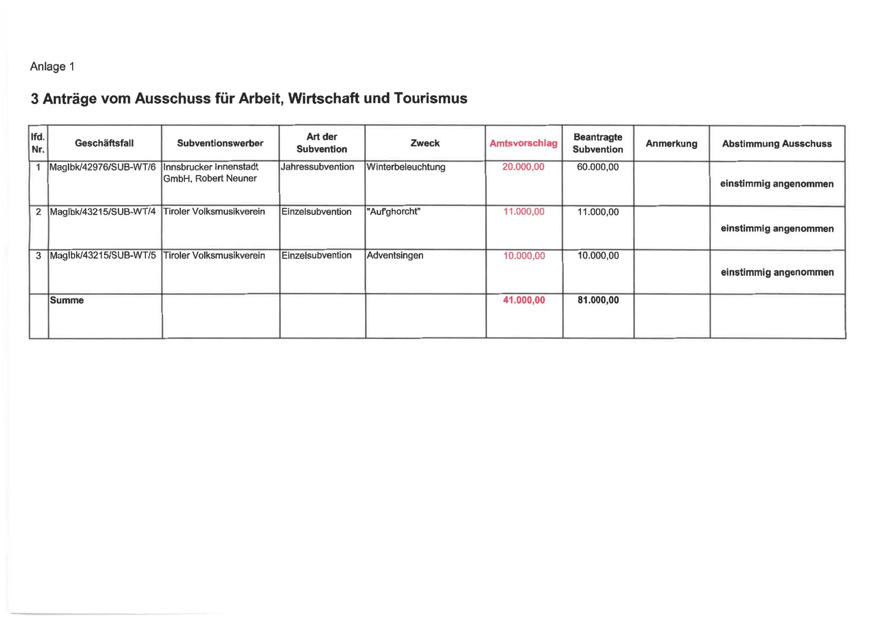 3 Anträge vom Ausschuss für Arbeit, Wirtschaft und Tourismus