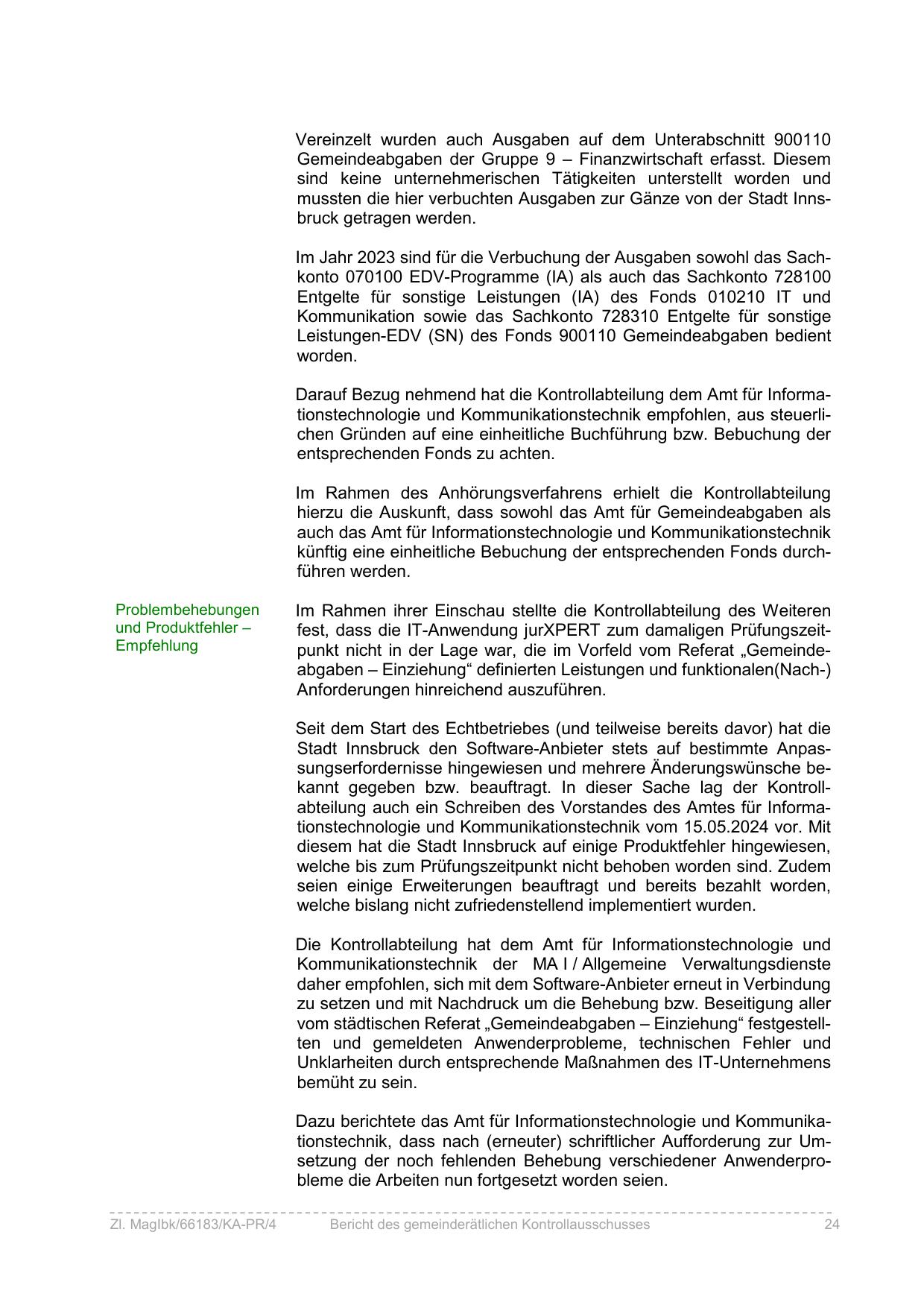 Stadt Innsbruck den Software-Anbieter stets auf bestimmte Anpassungserfordernisse hingewiesen und mehrere Änderungswünsche bekannt gegeben bzw. beauftragt. In dieser Sache lag der Kontrollabteilung auch ein Schreiben des Vorstandes des Amtes für Informationstechnologie und Kommunikationstechnik vom 15.05.2024 vor. Mit