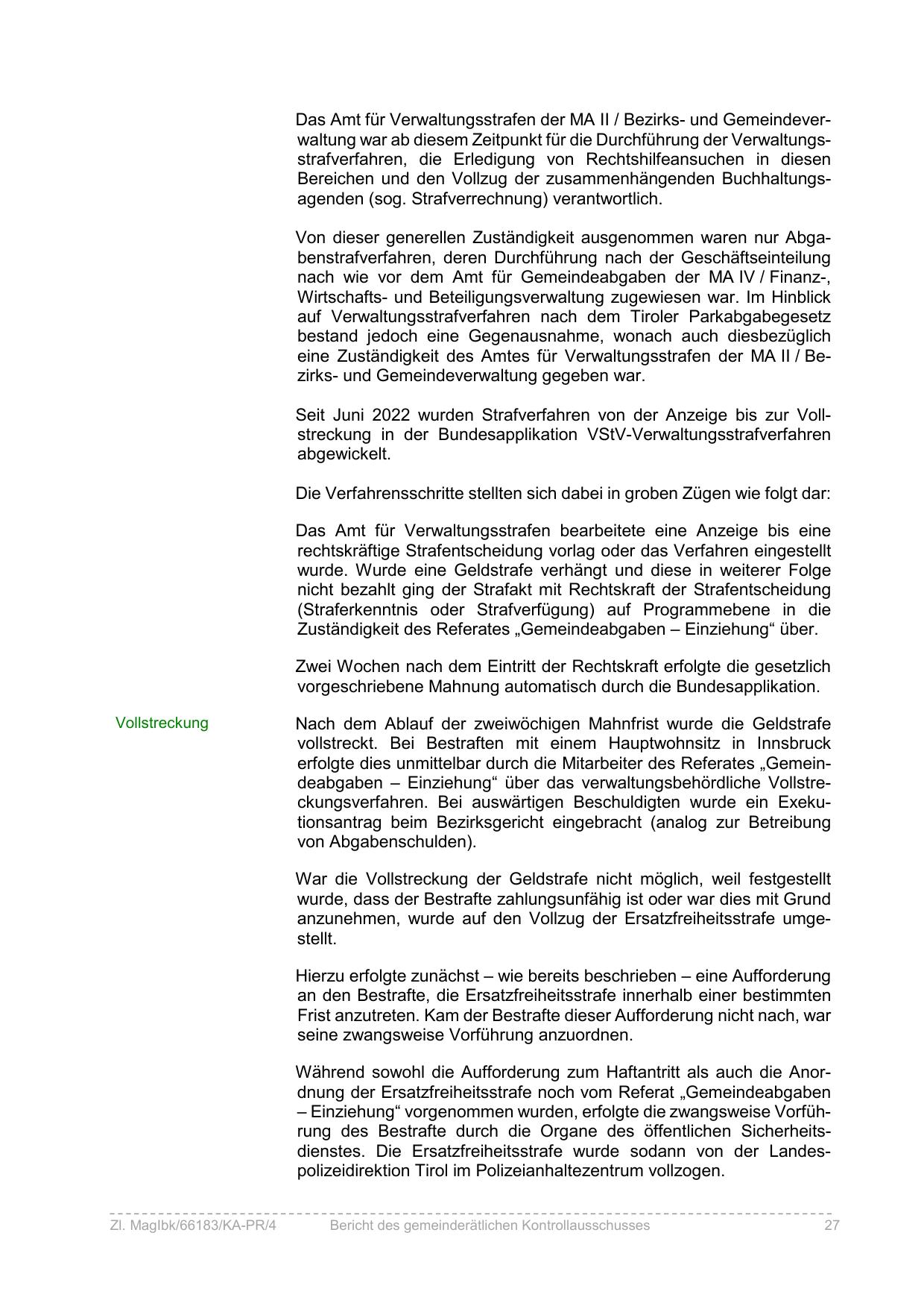 erfolgte dies unmittelbar durch die Mitarbeiter des Referates „Gemeindeabgaben – Einziehung“ über das verwaltungsbehördliche Vollstreckungsverfahren. Bei auswärtigen Beschuldigten wurde ein Exekutionsantrag beim Bezirksgericht eingebracht (analog zur Betreibung