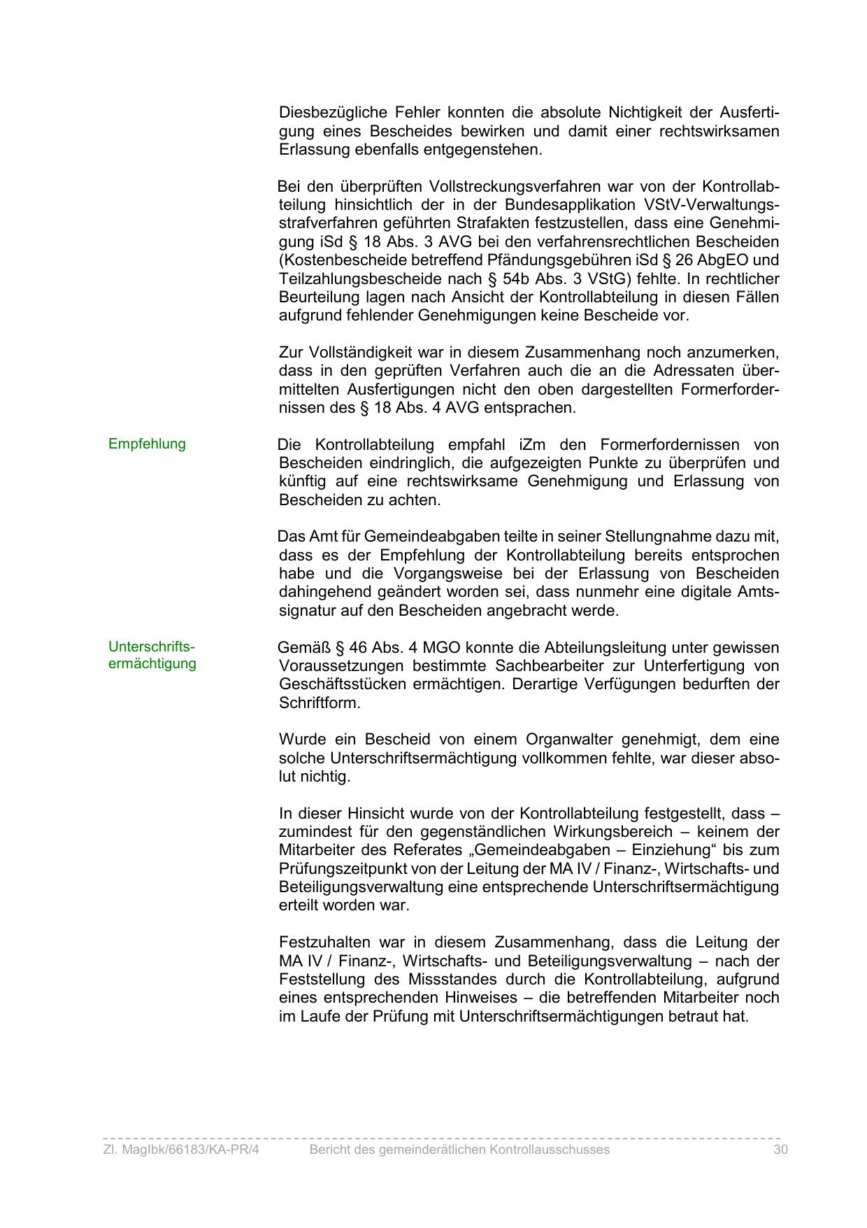 Bei den überprüften Vollstreckungsverfahren war von der Kontrollabteilung hinsichtlich der in der Bundesapplikation VStV-Verwaltungsstrafverfahren geführten Strafakten festzustellen, dass eine Genehmigung iSd § 18 Abs. 3 AVG bei den verfahrensrechtlichen Bescheiden